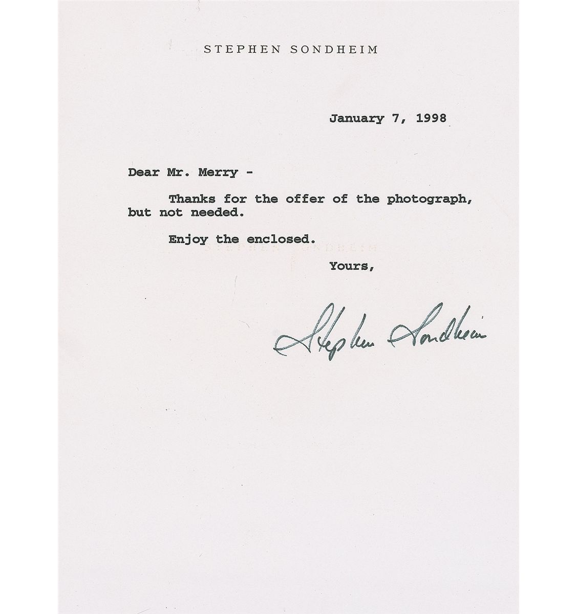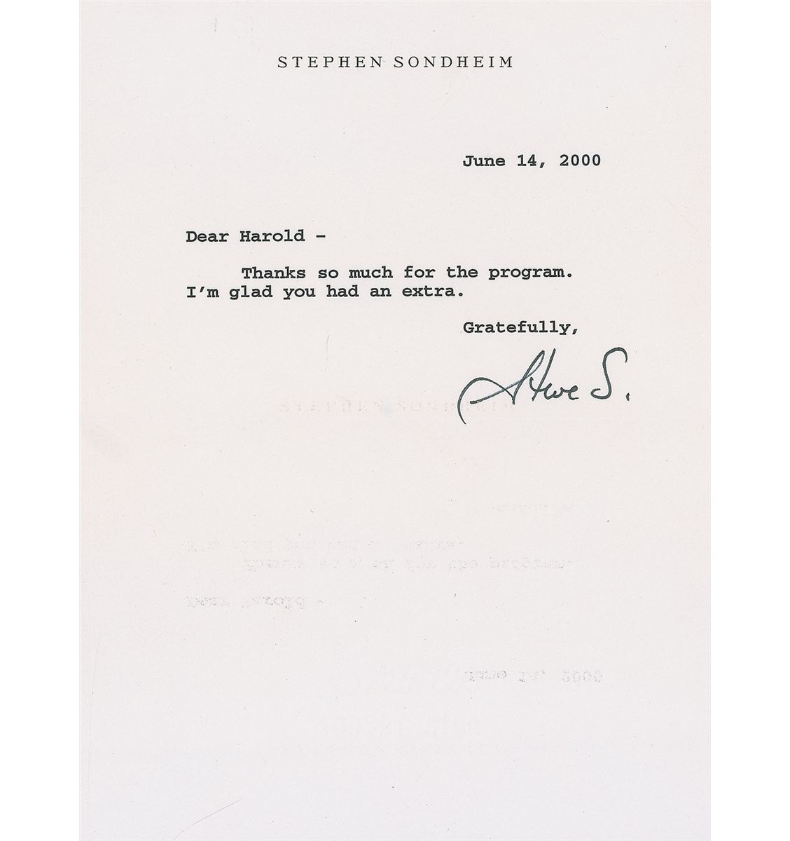 Two TLSs, one signed “Steve S.,” and one signed in full, both one page, 5.75 x 7.75, personal letterhead, dated 1998 and 2000, both written to Harold Merry. Both are brief letters of thanks for an offer of a photograph and for an extra program for an unidentified event. Each is accompanied by its original transmittal envelope. In fine condition.