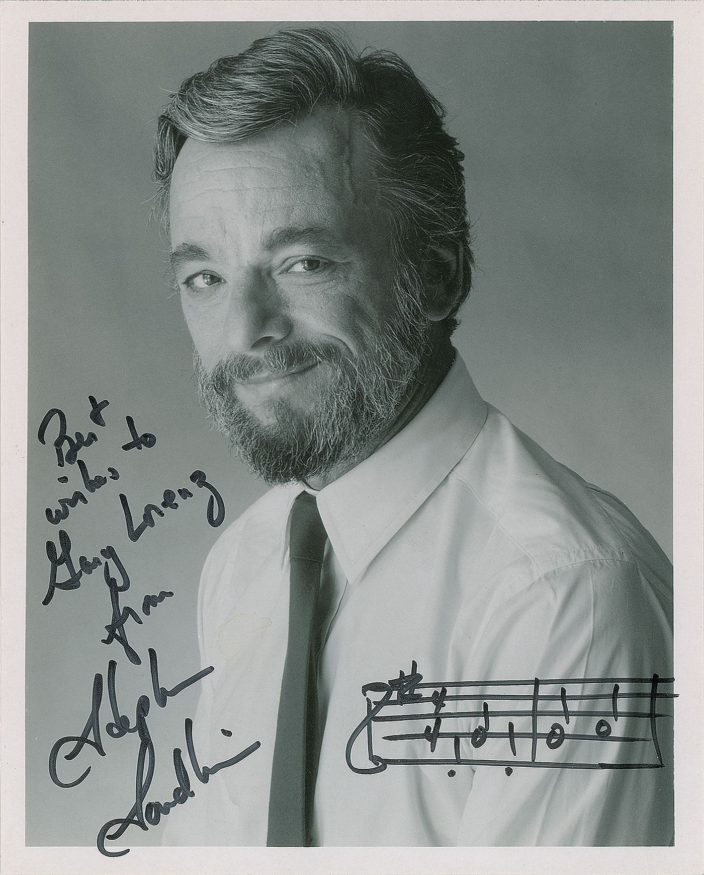 Semi-glossy 8 x 10 lightweight photo of Sondheim wearing a shirt and tie, signed and inscribed in black felt tip, "Best wishes to Gary Lorenz, from Stephen Sondheim," who adds two bars of music from an unknown work. In fine condition, with a few light surface creases.