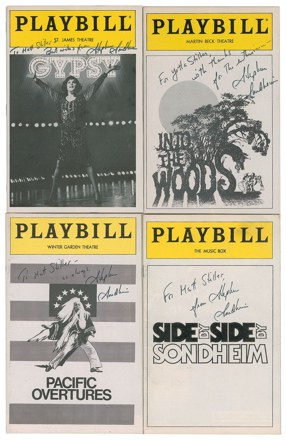 Four playbills for Sondheim's productions Pacific Overtures, Side by Side, Into the Woods, and Gypsy, each signed and inscribed on the front cover in black felt tip by Stephen Sondheim. In fine condition.