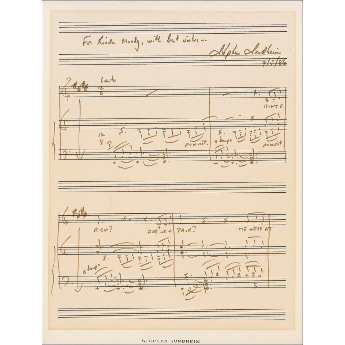 AMQS on an off-white 9.5 x 12.5 musically-lined sheet. Sondheim pens the opening four bars of music and lyrics to ‘Send in the Clowns,’ signed and inscribed at the top, “For Linda Moody, with best wishes—Stephen Sondheim 9/5/86.” In fine condition, with a uniform shade of toning from previous display.