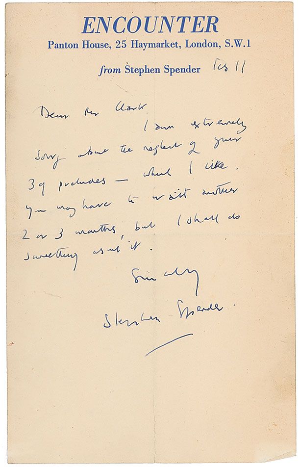 Poet, novelist and essayist (1909–1995) who was appointed the seventeenth Poet Laureate Consultant in Poetry to the United States Library of Congress in 1965. ALS, one page, 5 x 8, Encounter letterhead, February 11. Letter to a gentleman. In full: “I am extremely sorry about the neglect of your 3q preludes—which I like. You may have to wait another 2 or 3 months, but I shall do something about it.” In very good condition, with central horizontal and vertical fold, one passing through a single letter of signature, partial separation to vertical fold, and scattered toning and soiling.
