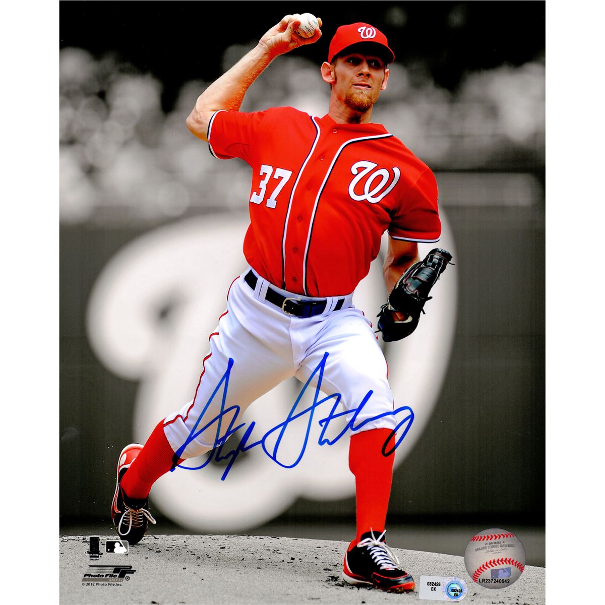 Stephen Strasburg signed Washington Nationals pitching action spotlight 8x10 photo. Item comes with a MLB Authentic and a Schwartz Sports Memorabilia tamper-proof numbered hologram and Certificate of Authenticity. Both hologams can be verified online.