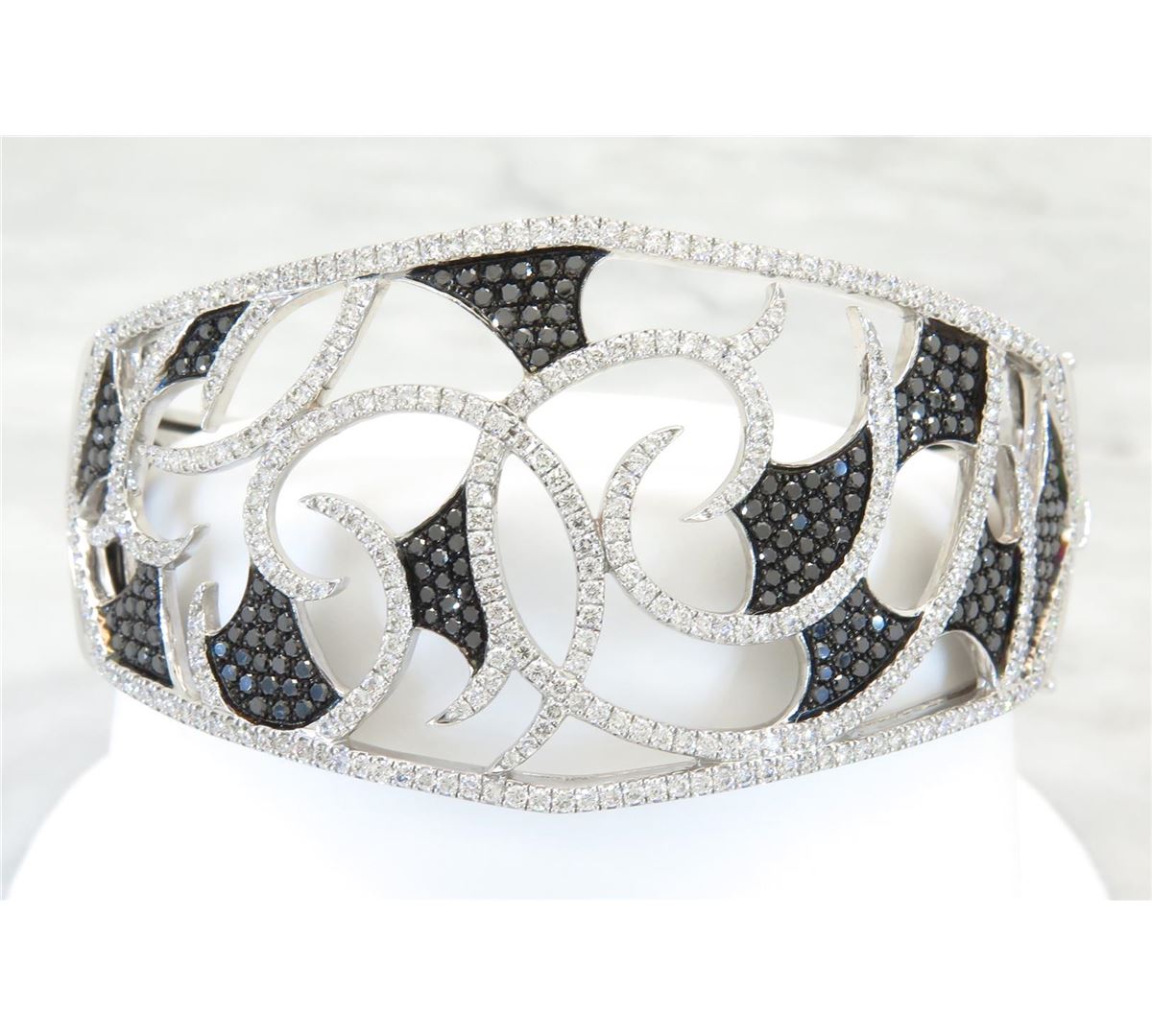 One tested 18K white gold designer Stephen Webster diamond bracelet. Containing: 180 black and 345 white Round Brilliant Cut Diamonds. Clarity of white diamonds: VS-SI, Color: F-H. Approximate total diamond weight: 3.32CTW. All diamonds are graded in the mounting unless otherwise stated. Weight of bracelet: 49.3 grams, Size: 6.5" (inside measurement). The bracelet is from the Stephen Webster Fly By Night Mid Vortex collection.