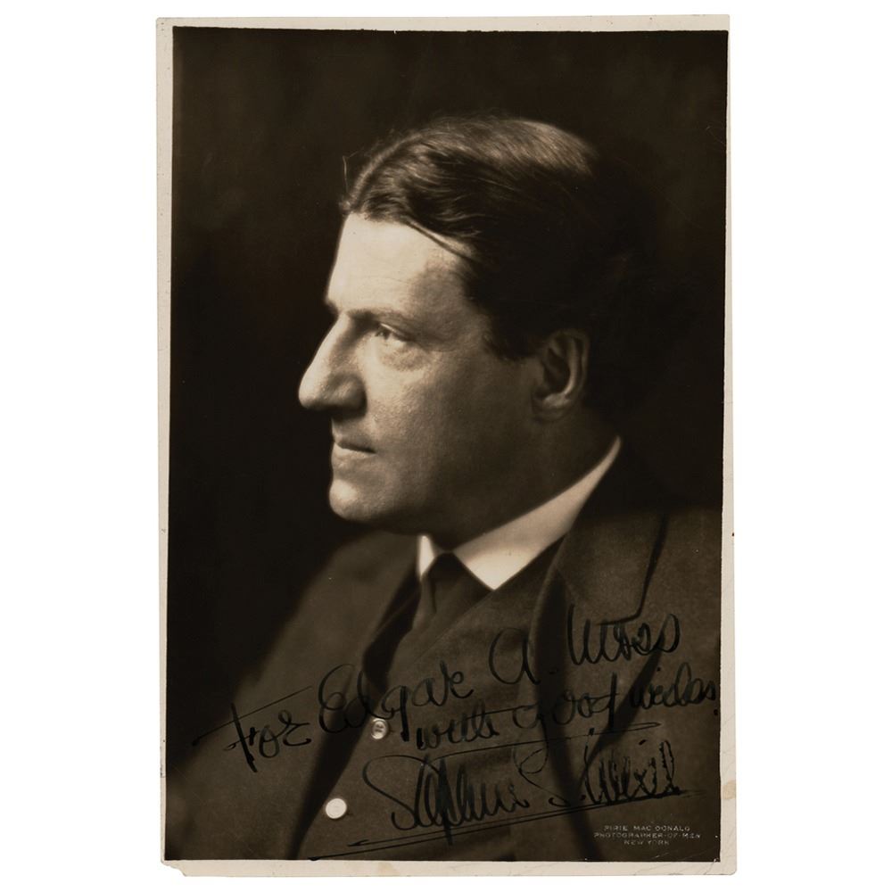 Vintage glossy 6 x 9 photo of Wise in near profile, signed and inscribed in fountain pen, "For Edgar A. Moss, with good wishes, Stephen S. Wise." Blindstamped in the lower right by New York's Pirie MacDonald Photography. Reverse bears an affixed Moss Advertising Agency label. In very good to fine condition, with scattered light creasing and missing lower left corner tip.