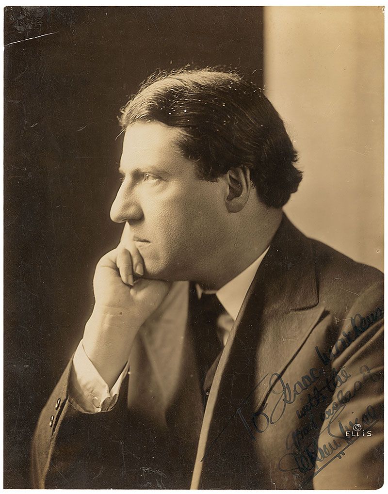 Reform rabbi and Zionist leader (1875–1949). Vintage glossy 7.5 x 9.5 photo of Wise looking into the distance, signed and inscribed in fountain pen, “To Isaac Markeus, with the good wishes of Stephen Wise.” Affixed to a slightly larger sheet. In very good condition, with scattered creases and silvering to dark areas of the image.