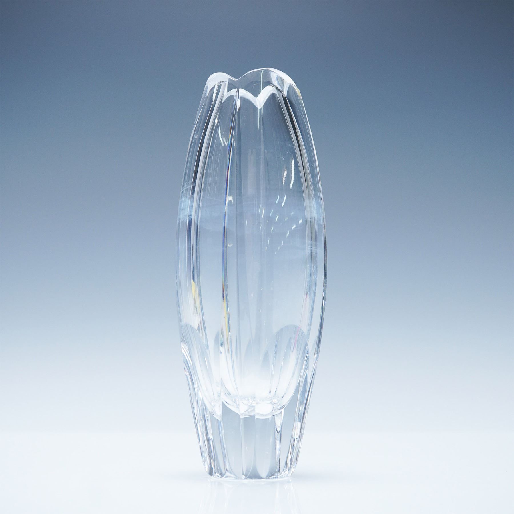This elegant, handcrafted Stephens crystal vase, signed "Stephens" on the base, features a sculptural fluted design with a gently curved, multi-faceted body that beautifully refracts light. The high-quality crystal exhibits exceptional clarity and craftsmanship, making it a striking decorative piece. Its contemporary form and refined aesthetic make it a versatile addition to any collection of fine glassware and modern decor.