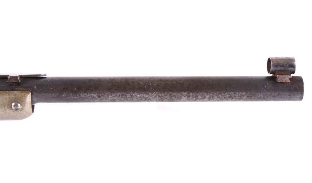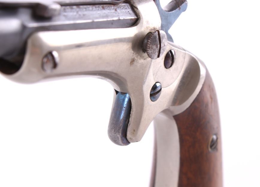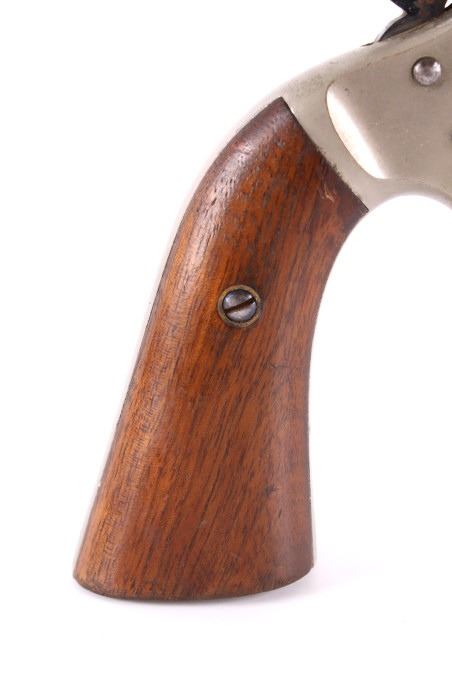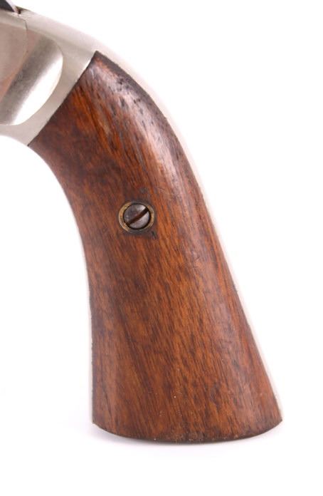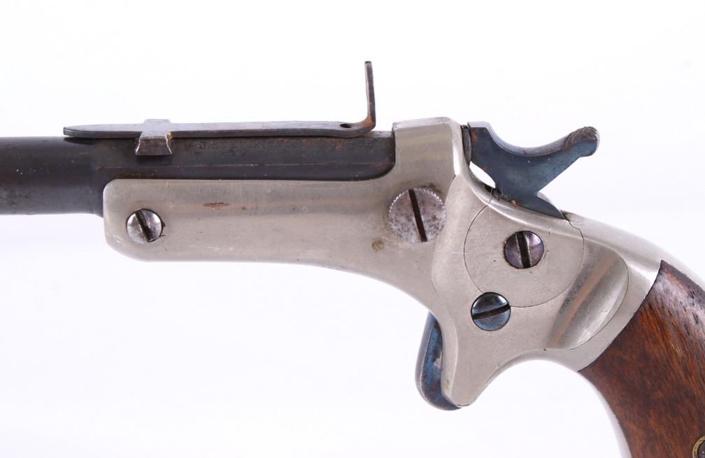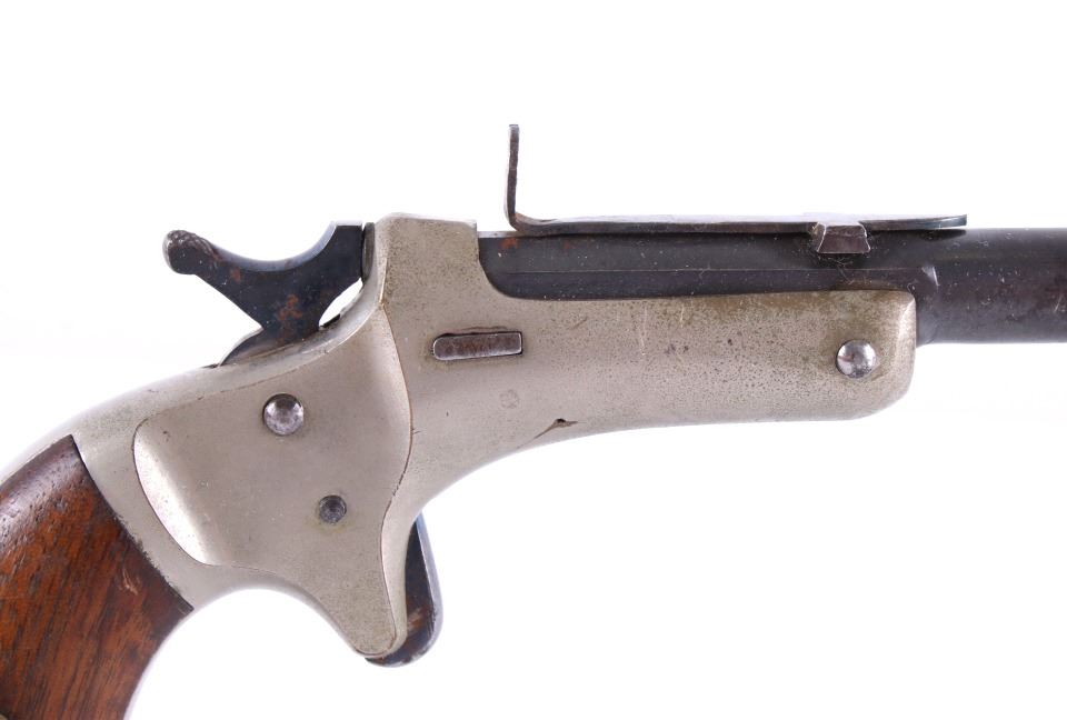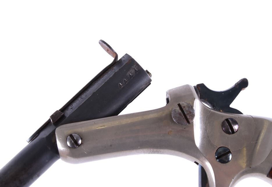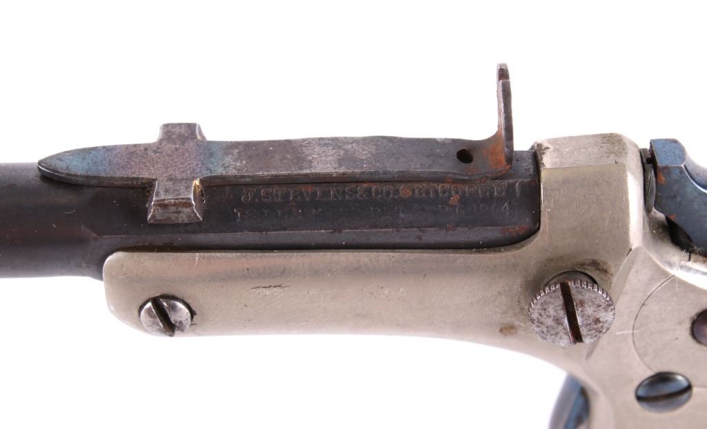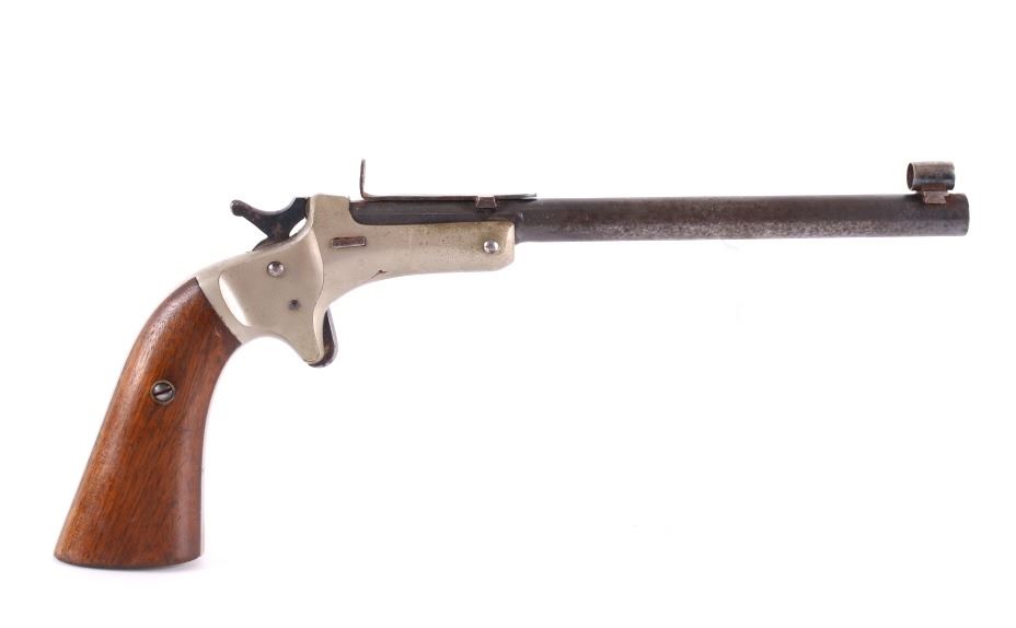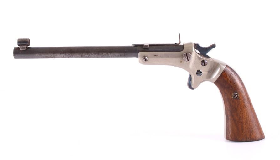 This lot features an original rare Stevens Model No. 43 Diamond .22 single shot competition pistol. The handgun is chambered in a .22 Rimfire caliber and shows a steel frame with longer grip having smooth walnut factory original inserts. The piece shows a round 6-inch (4.5” round and 1.5” octagonal) barrel with dovetail mounted bead front sights and standard adjustable notched rear sights. This is an all serial number matching firearm. The pistol shows a nickel-plated steel frame retaining some of the original finish and the barrel retaining the original blue showing. This pistol shows good condition with minor handling wear and signs of use. Serial Number: 4444. This firearm qualifies as a Curio & Relic, and requires FFL Transfer or NICS Background Check. Matt