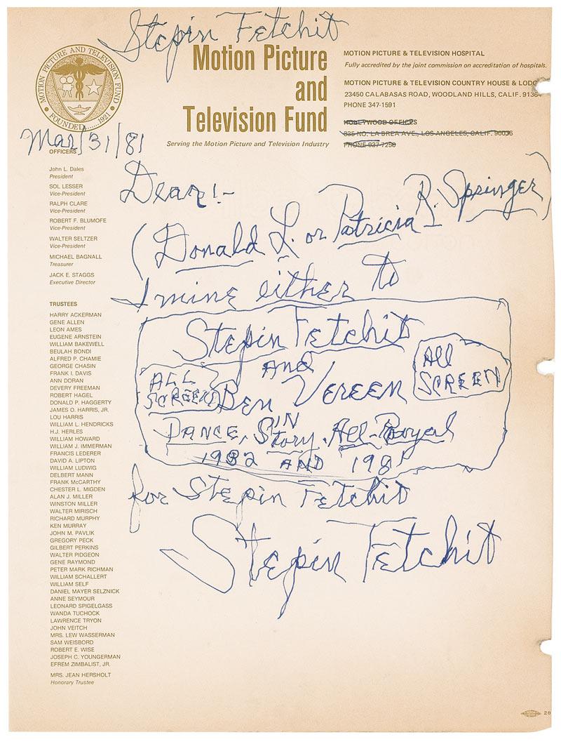 ALS, one page, 8.25 x 11, Motion Picture and Television Fund letterhead, March 31, 1981. Short incoherent letter signed a total of four times by Fetchit. In very good condition, with scattered toning and creasing, and binder holes to right edge. Accompanied by the original mailing envelope, signed vertically along the left edge by Fetchit.