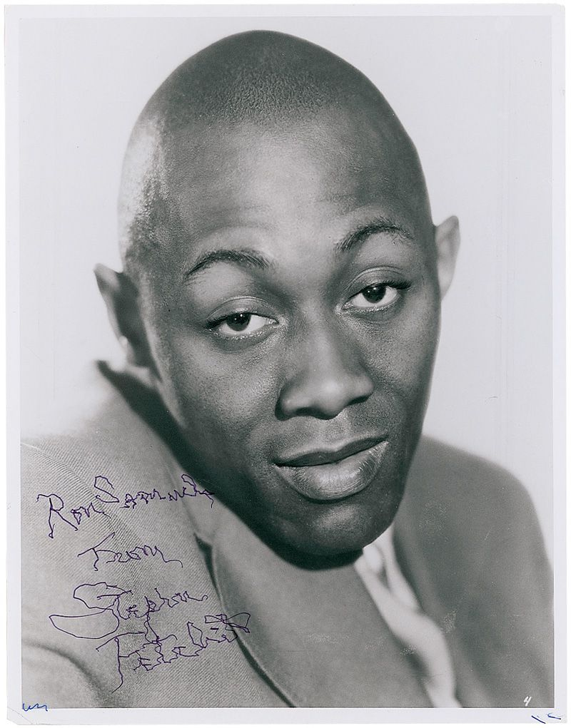 Glossy 8 x 10 photo of a young Fetchit, signed and inscribed in old age in purple felt tip “Ron Samuels, from Stepin Fetchit.” Some corner tip creasing, a few surface creases and impressions, a couple stray ink marks to the bottom border, and an impression from a first attempt at the inscription, otherwise fine condition.
