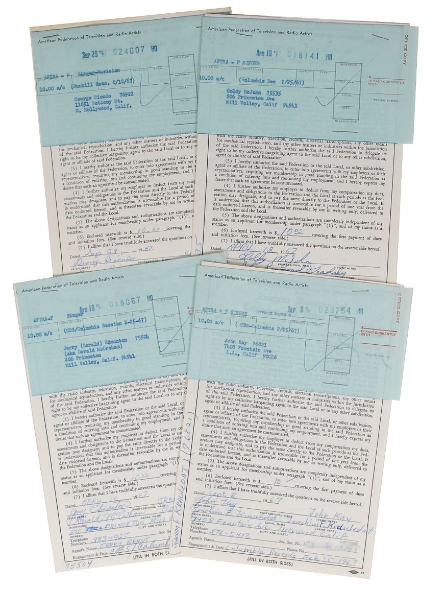 Four standard AFTRA membership applications, signed by John Kay, Jerry Edmonton, Goldy McJohn, and George Biondo, each one page both sides, 6 x 8.75, dated April–September 1967. Representing members of the earliest incarnations of Steppenwolf, the musicians sign multiple times with both their stage and given names, with Kay also signing, “Joachim F. Krauledat,” Edmonton signing, “Gerald McCrohan,” and McJohn signing, “John Raymond Goadsby,” and Biondo signing, “George Biondo.” In overall fine condition, with expected document wear. This lineup ceased to exist in 1971 when McJohn left the band.