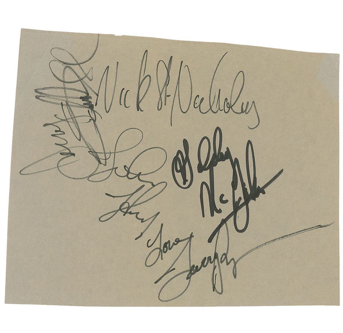 Felt tip signatures, “John Kay,” “Goldy McJohn,” “Nick St. Nicholas,” “Jerry Edmonton,” and “Larry Byrom,” on a tan 9.25 x 7.5 sheet. Irregularly trimmed edges, scattered creasing, a chip to top edge, and signatures slightly overlapping, otherwise fine condition.