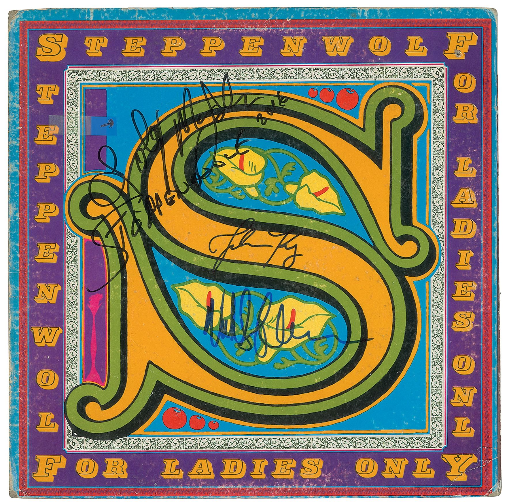 For Ladies Only album by Steppenwolf, signed on the front cover in black felt tip by Goldy McJohn, who adds "Steppenwolf 2016" and John Kay, and in blue felt tip by Nick St. Nicholas. In fine condition, with light scuffing and edge wear. The record is not included.