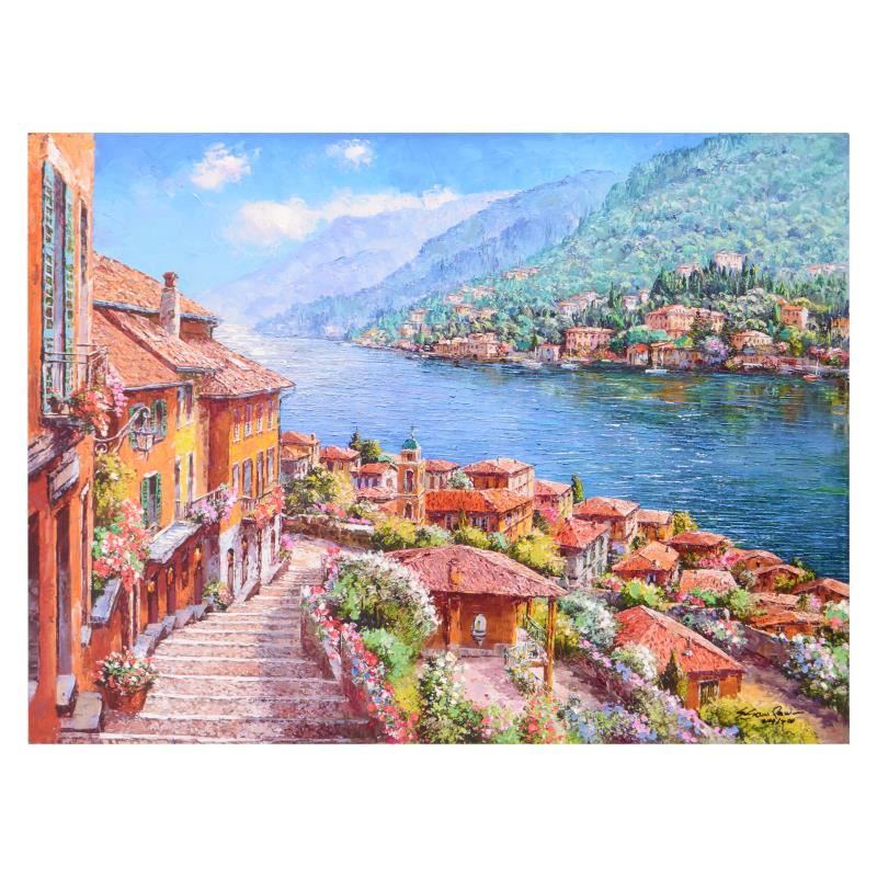 "Steps to Lake Como" is a hand embellished limited edition serigraph on canvas by Sam Park, numbered and hand signed by the artist. Includes Certificate of Authenticity. Measures approx. 32" x 24" (image).