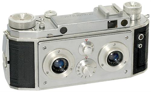 Stereo-Kamera "Verascope F40", 1951 Busch Camera Corp., Chicago. Nr. 3395091, gebaut von Jules Richard, Paris. Hier das Export-Modell für USA. Mit Objektiven von Som Berthiot Paris "Flor 3,5/40" und Guillotine-Verschluß 1-1/250 Sek. Gekuppelter Entfernungsmesser (Feet), umschaltbar für Stereo- oder Mono-Aufnahmen 24 x 30 mm. Mit Tasche. - Eine der besten Stereo-Kameras aller Zeiten!