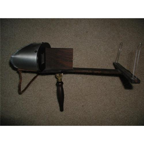 Early 1900's Stereogram 3D Photo Viewer - Old stereoviewer made of veneered wood with a hinged handle.  It measures about 12" long and 7" High with the handle holder down. Appears to be all original and shows general wear from age and use.  The only readily apparent flaw is the soft velar should ride around the rim of viewer. This could be gently glued back. Comes with a 2 viewer cards or Orthostereography. (This uses images presented side-by-side). This kind of stereography goes back a long time, and was quite popular around the turn of the 19th century. This two cards show a sassy maid. One card reads: Why, you little beauty: How long have you been our cook? The other card reads: Mr. and Mrs. Newlywed's new "French Maid"!These captions also appear in 5 different languages.
