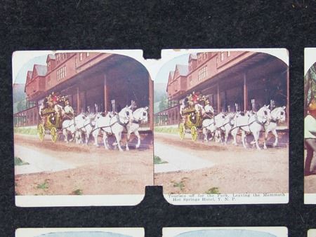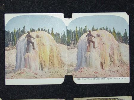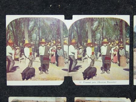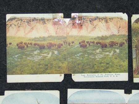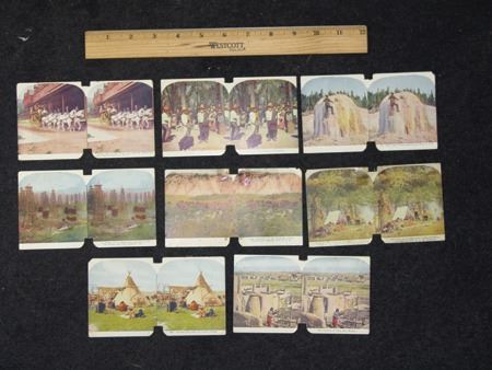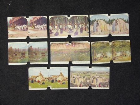 Early 1900s, Collection of eight (two are two-sided) color stereoptic subject cards including "The Pueblo of Taos, NM," "Drying Fish Meat in a Sioux Camp," "Last Remnants of the American Bison," and five others. Good, used condition. 6" x 3-1/2" each