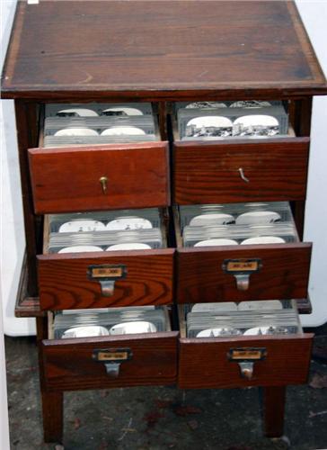 Wooden storage cabinet for stereoscope cards. This cabinet is very old and comes full of numbered cards by Keystone View Company. Include are over 400 cards depicting scenes across the US, S. Am., Europe, and Asia offering the viewer an incredible opportunity for armchair travel.