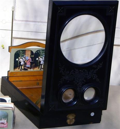Stereoscope viewer in black ebonized wooden case with large magnifier. Measures approximately 14" x 8 ½” x 3 ½" when closed. Comes with 30 cards of various subjects.