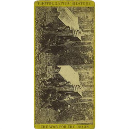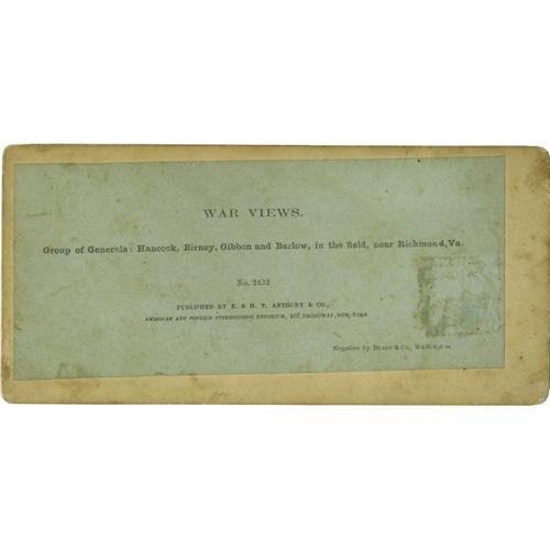 <B>Stereoview of Gen. Hancock and Staff Near Richmond</B></I> taken in 1864. From left to right are Generals Francis C. Barlow, Hancock, David B. Birney, and John Gibbon. All of these men would see action at Gettysburg. Entitled "War Views", this stereoview was taken from a negative by Brady and published by E. & H. T. Anthony. Minor wear to the board but a bright crisp picture of the men at camp.<BR><BR><b>Shipping:</b> Miscellaneous Collectibles, Smal (<a target="_blank" href="http://www.heritageauctions.com/common/shipping.php">view shipping information</a>)