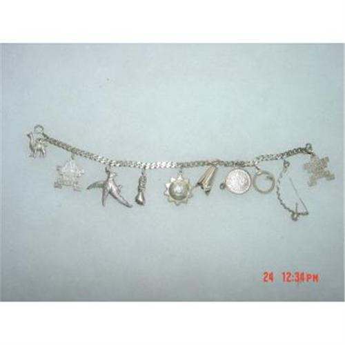 Here is a very old charm bracelet. There are 10 charms on this, and each one is very intricately detailed. I think these things represent something but I dont know what?? Maybe this is from Israel? This could also be Mexican? Lightweight charms of what I'm very sure are solid sterling silver. Very attractive sterling vintage charm bracelet