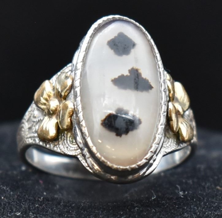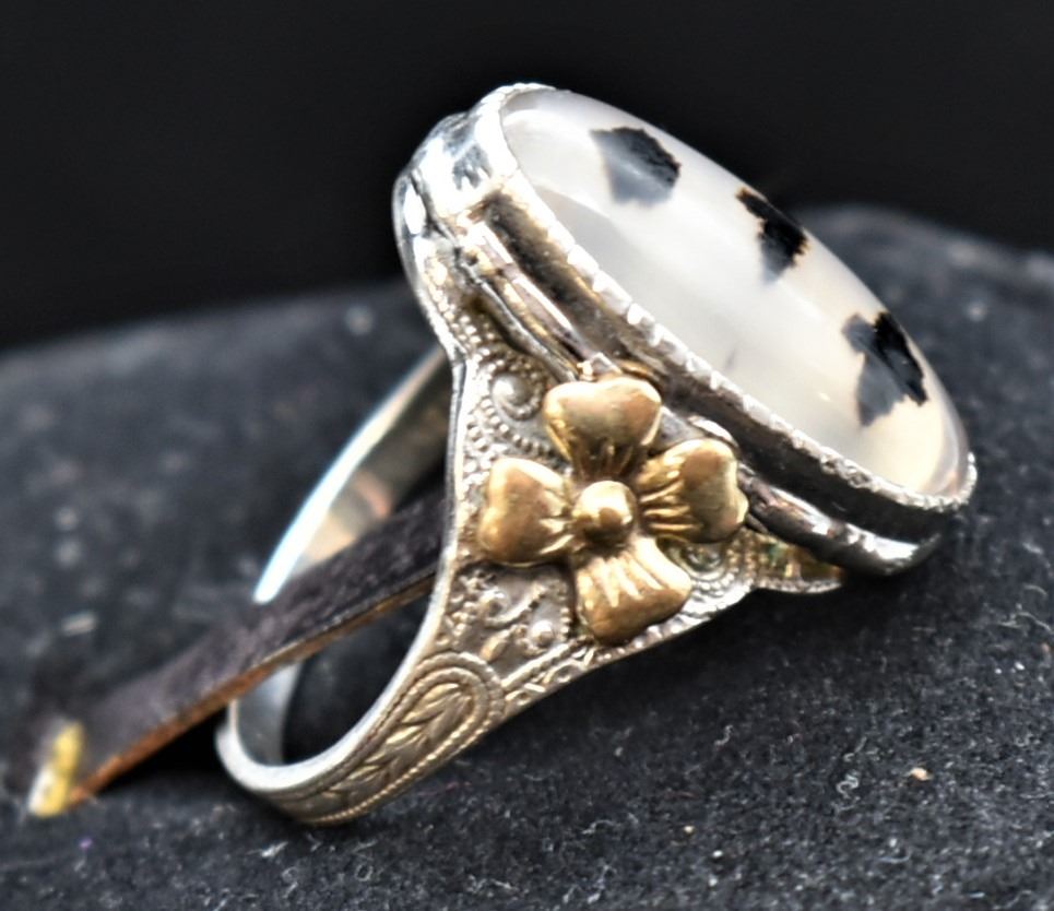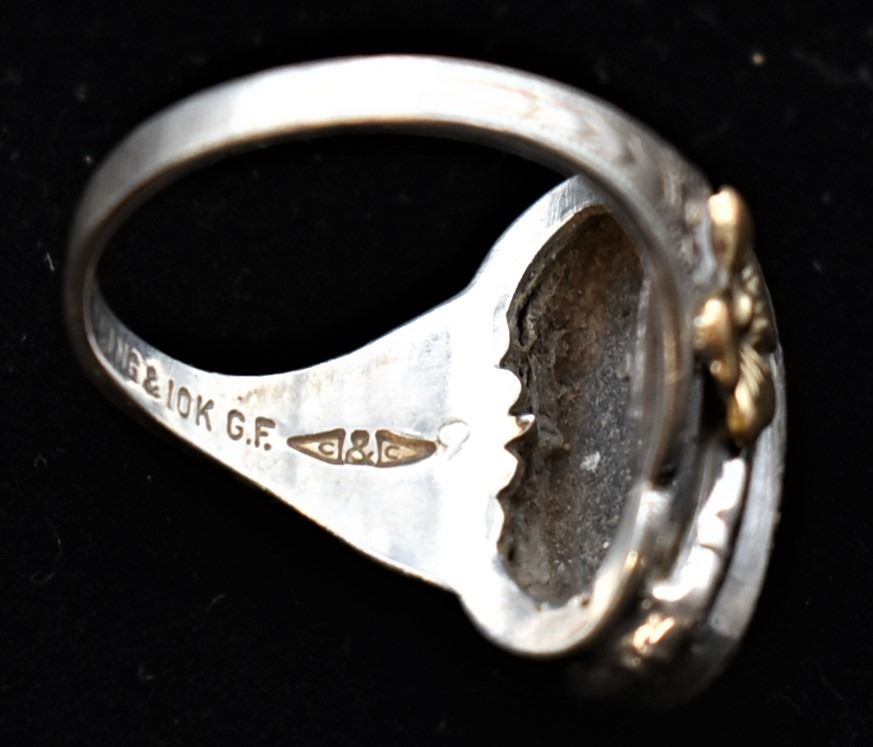 Vintage Estate Clark & Coombs Sterling & 10GF Moss Agate Ring, Size 7, measures .75''L, hallmarked and stamped Sterling 10K GF