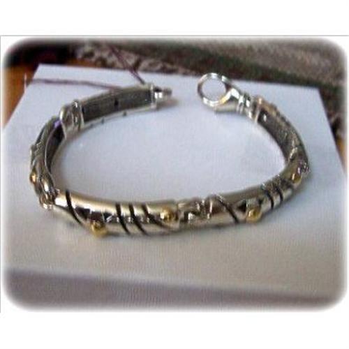 Lovely 7 inch designer 36.1 grams Sterling carved cable chunky link bracelet detailed with 18k yellow gold 'bead' accents inspired by the designs of David Yurman.<p>Bracelet consists of 5 carved cable design links with large lobster claw clasp, measuring 7.25 inches. Excellent unworn condition estate piece. Exceptional craftsmanship and quality. Marked on oval silver plaque with copyright symbol, stylized JH and 18kSS. Substantial silver weight of 36.1 grms.<p>