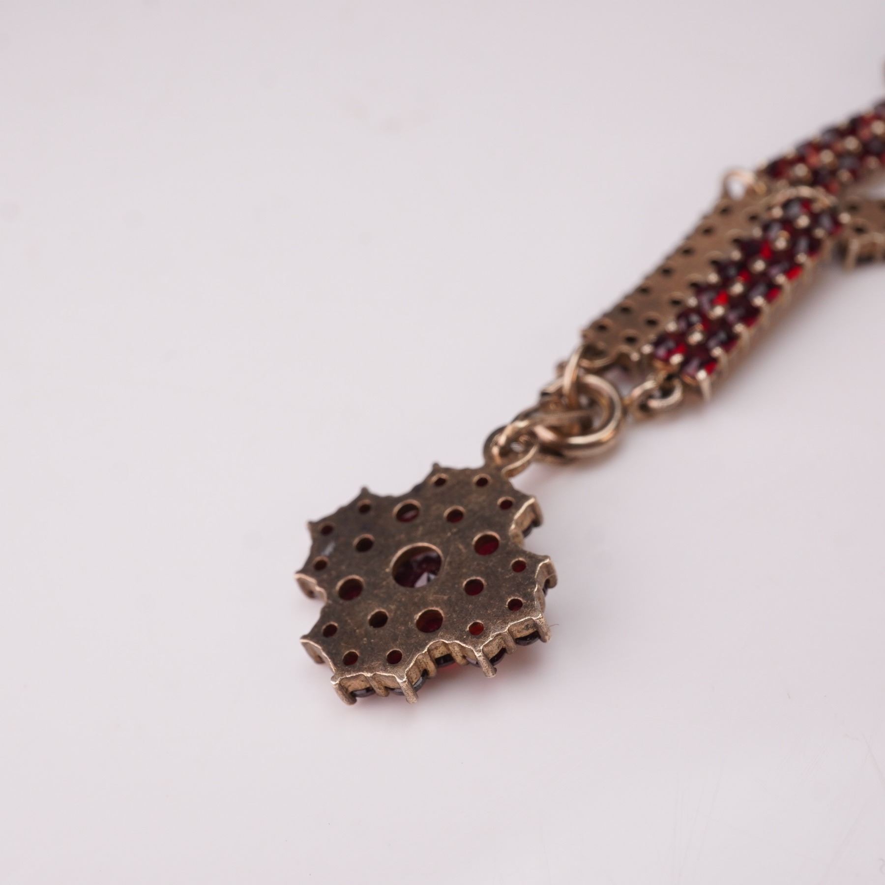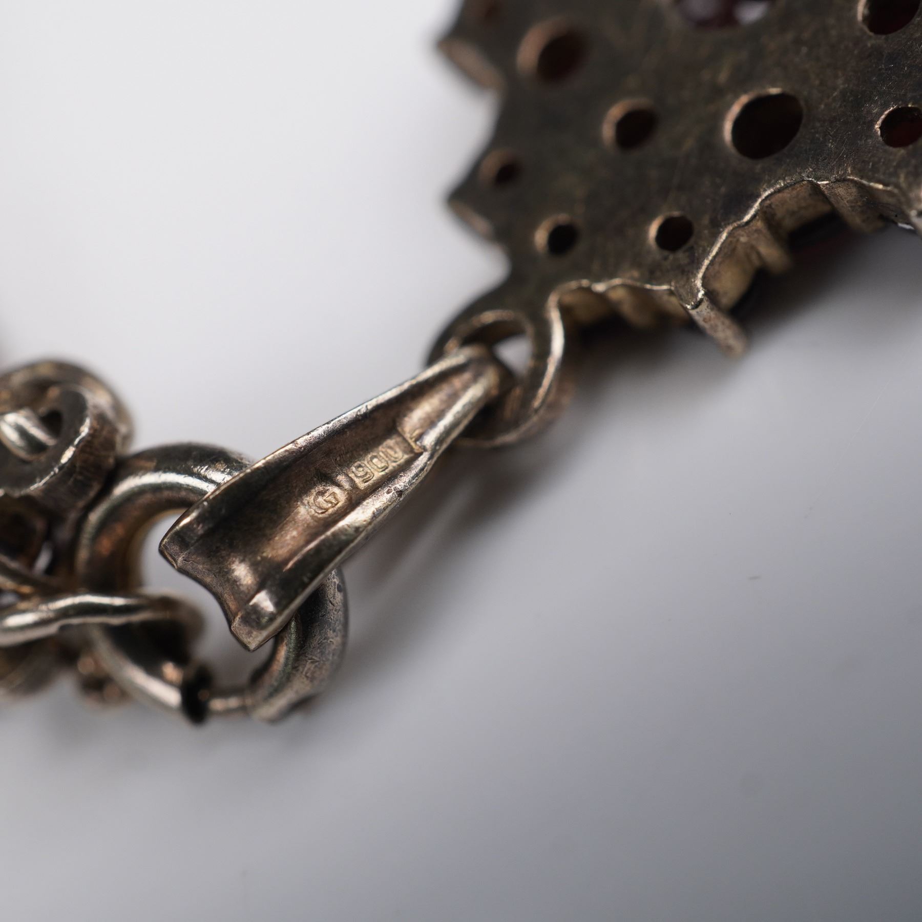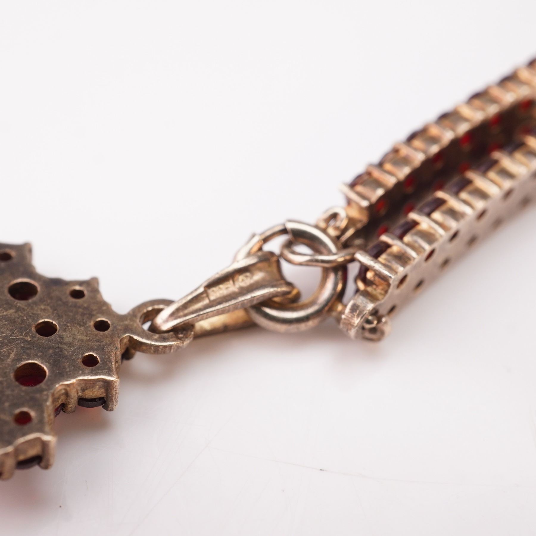 Finely crafted sterling silver bracelet stamped 900, featuring rectangular links set with rows of faceted deep-red garnets. A matching floral cluster pendant with a central round garnet is suspended from the bracelet, enhancing its elegant design. The back of each setting is open, allowing light to enhance the rich hue of the stones. This vintage piece combines detailed metalwork with the timeless appeal of garnets, making it a striking accessory for any collection. Total approximate weight: 11.57g.