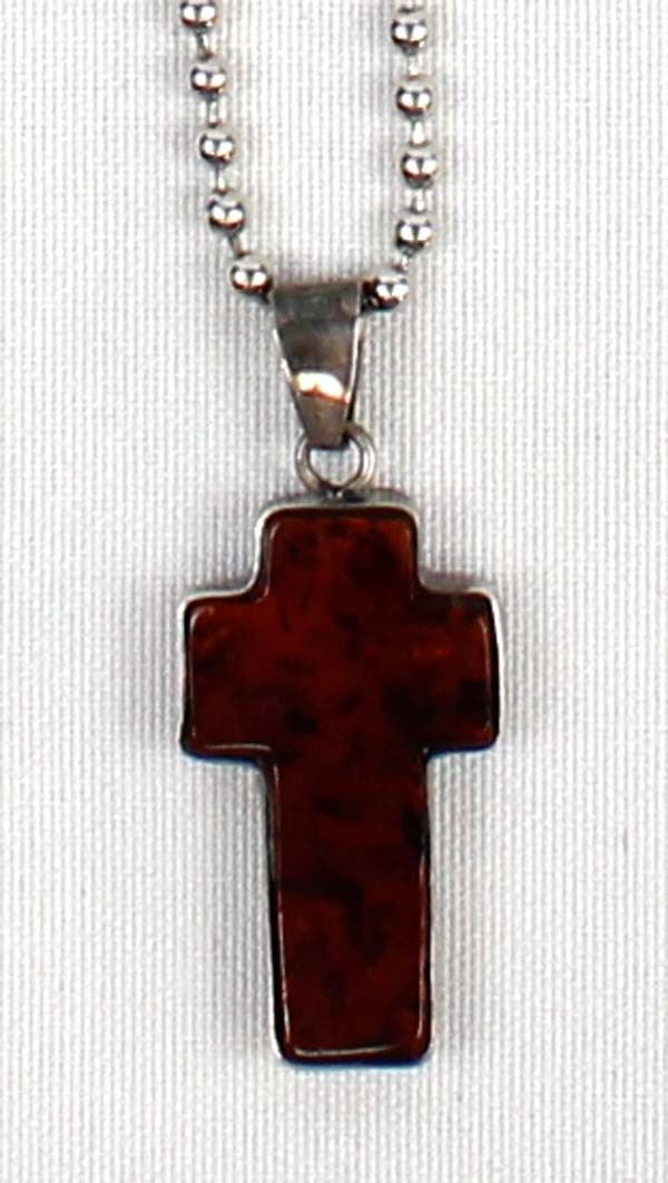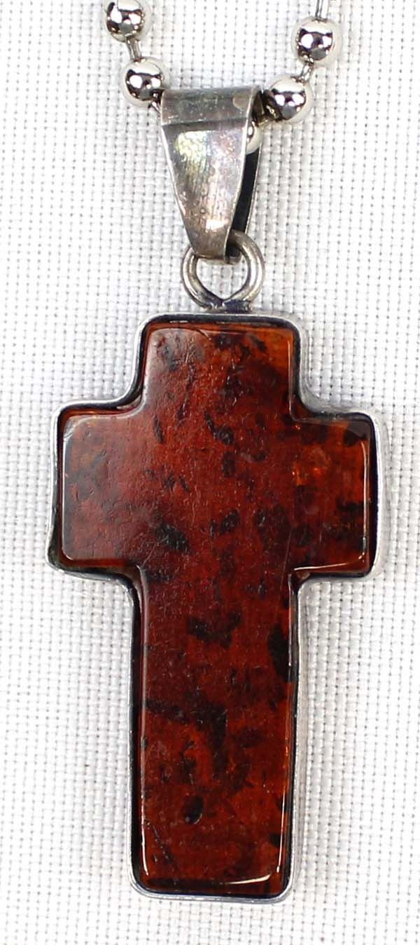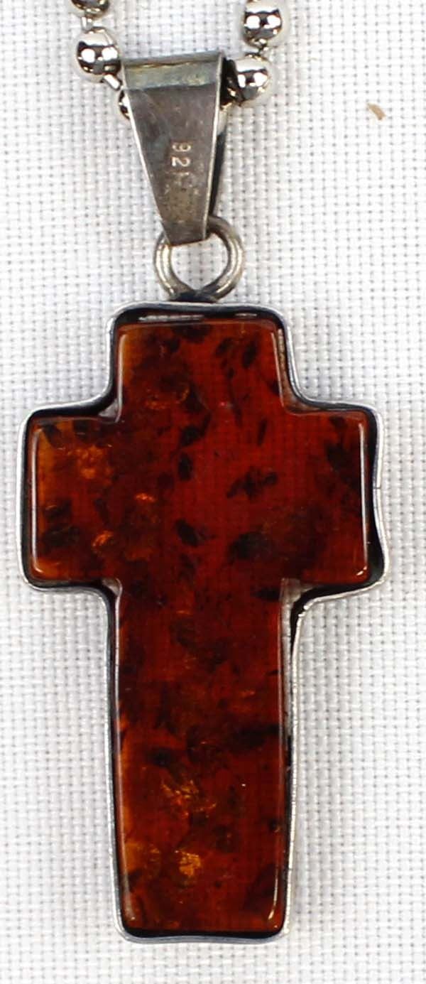 Sterling Amber Cross Pendant Necklace, bale is marked .925, cross measures 1.5'' x .75'', ball chain measures 28''L end to end