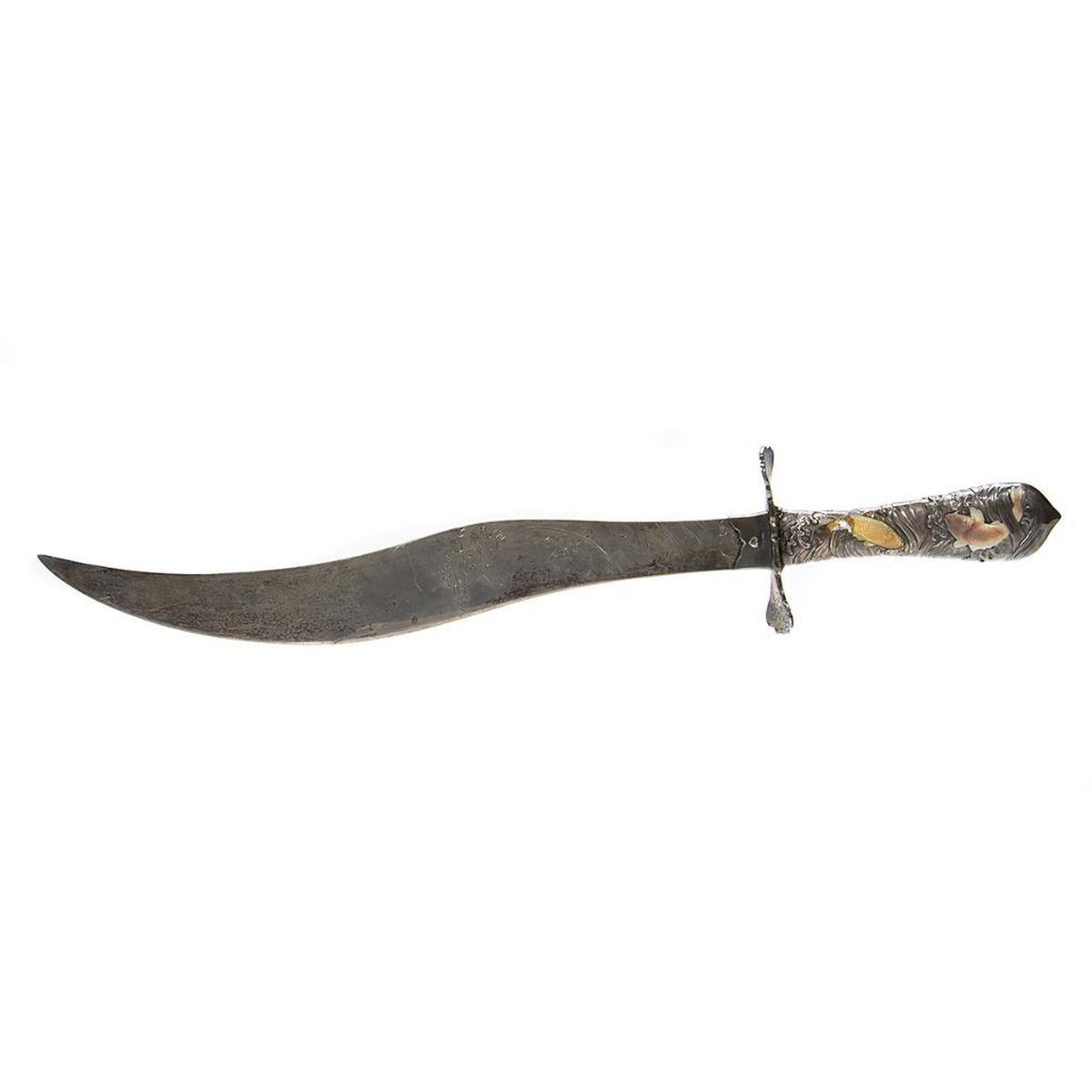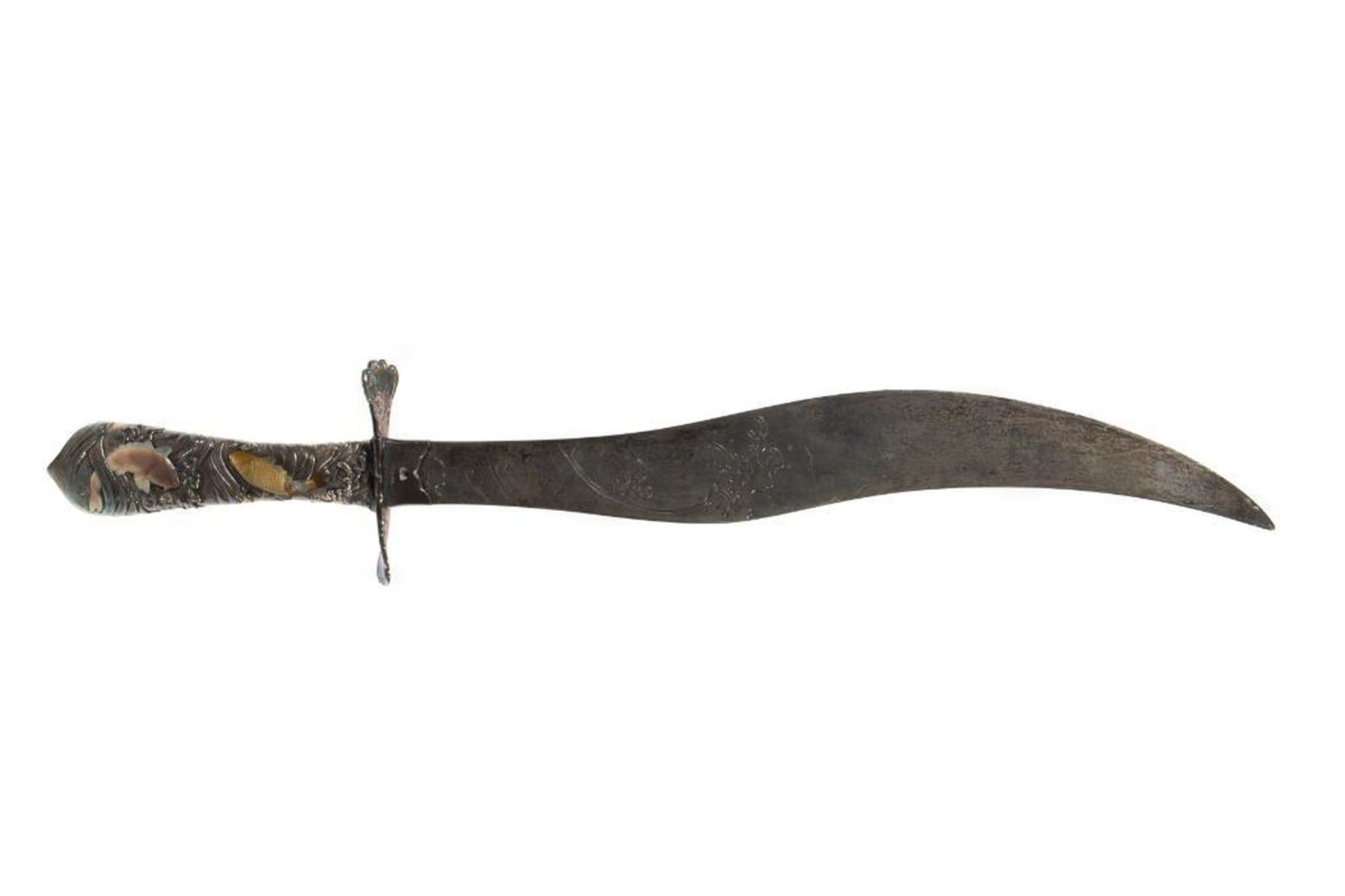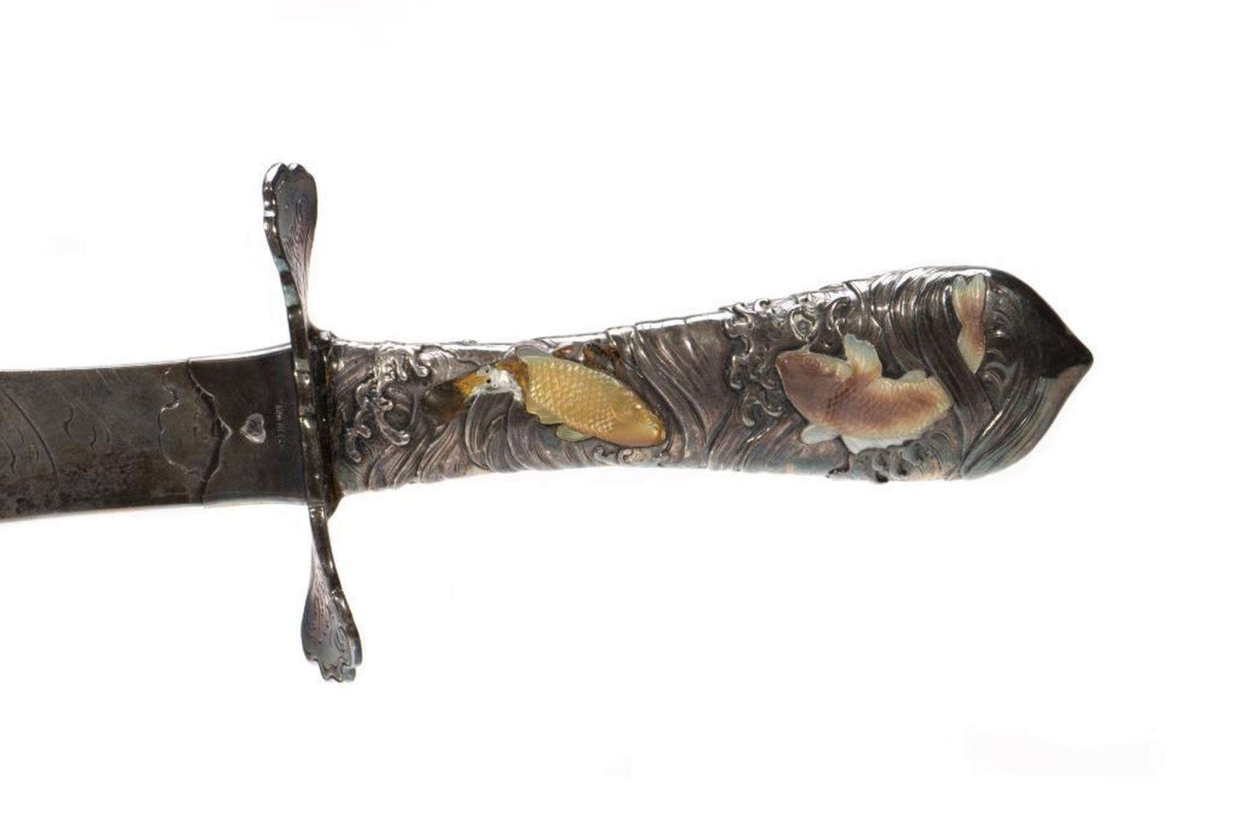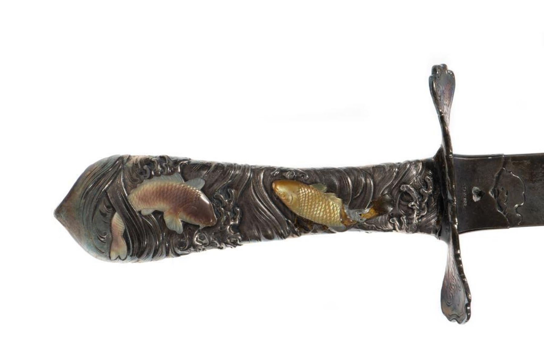 The curved blade incised with rolling waves, the hilt with gilt carp. 17in. l. Condition: Some tarnish, handle probably weighted