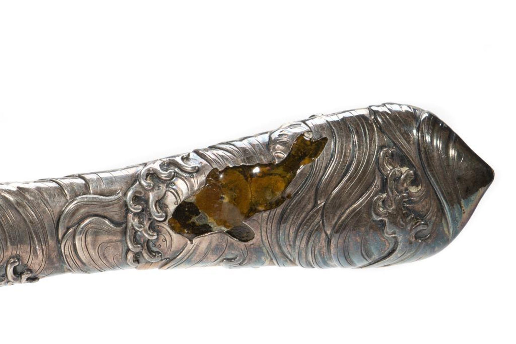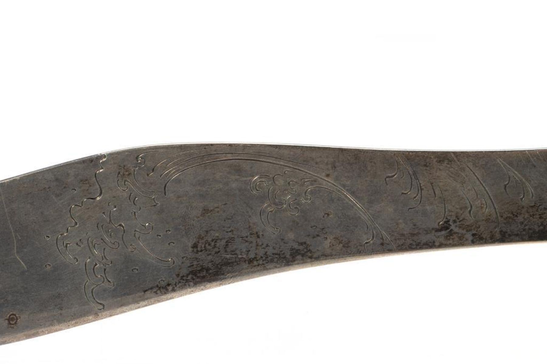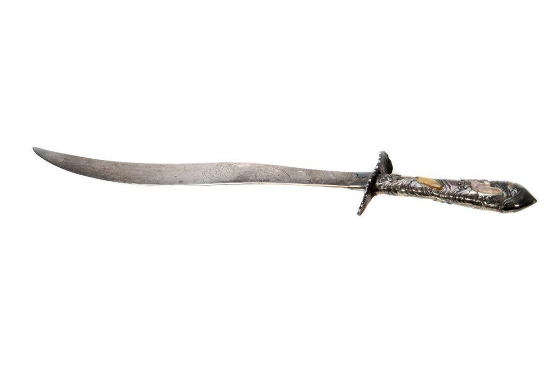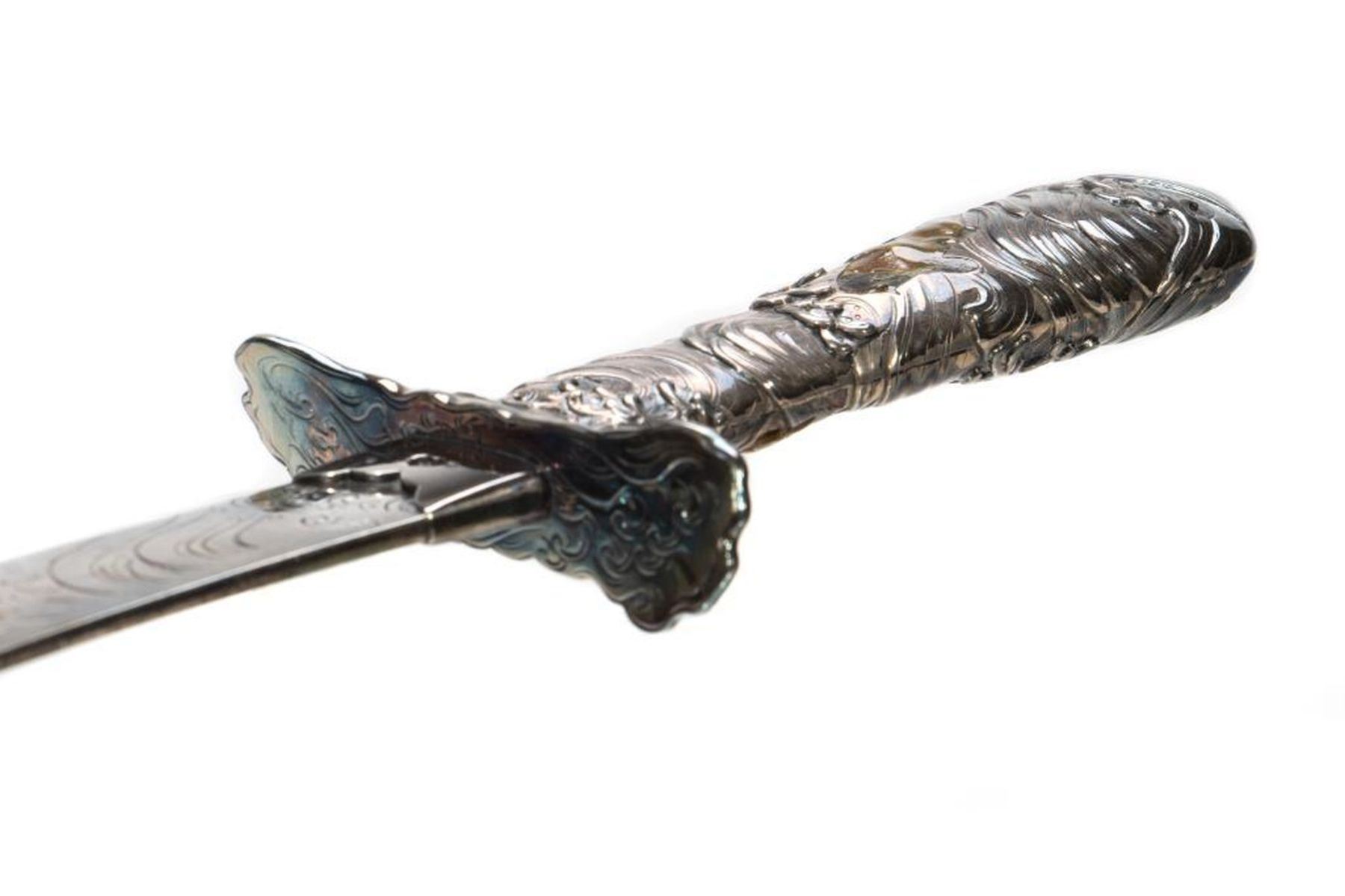The curved blade incised with rolling waves, the hilt with gilt carp. 17in. l. Condition: Some tarnish, handle probably weighted