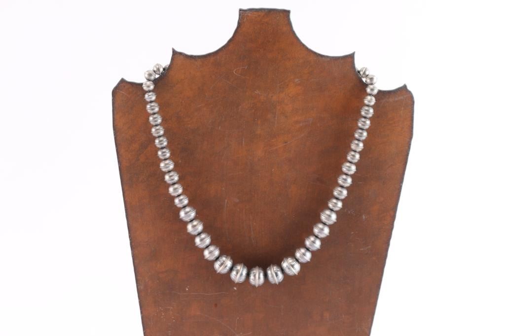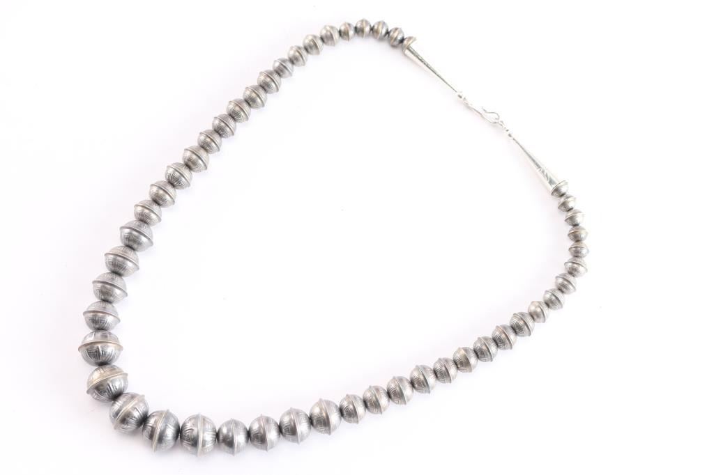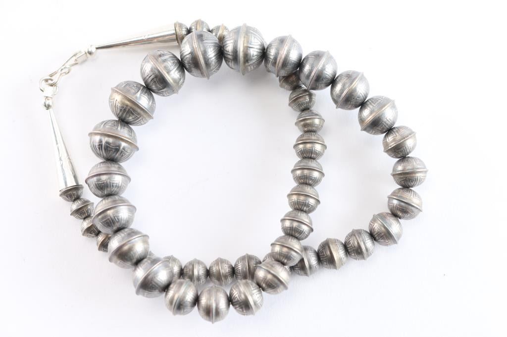 At the center, it's 13mm and gradually scales down to 7mm at the ends, and pulled through Sterling cones. The length of this necklace is 20"