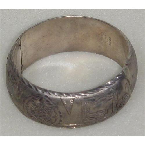 Mexican sterling silver bangle braclet, 15/16'' wide, hand engraved with mexican designs. Good weight, marked sterling, Mexico.