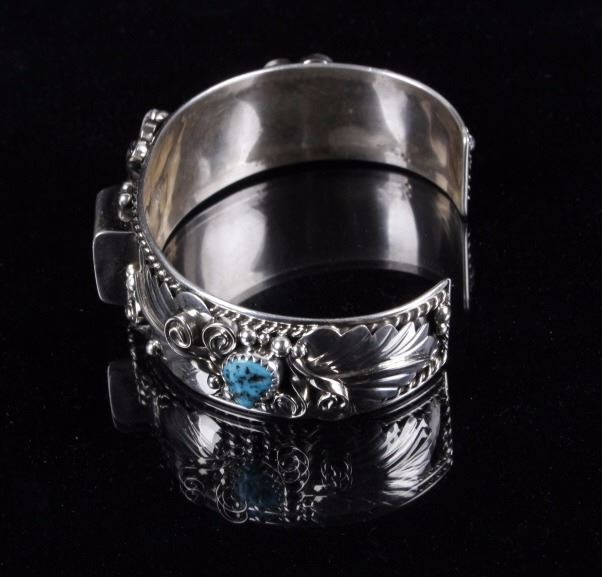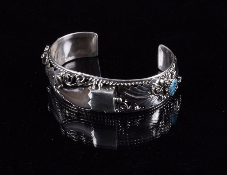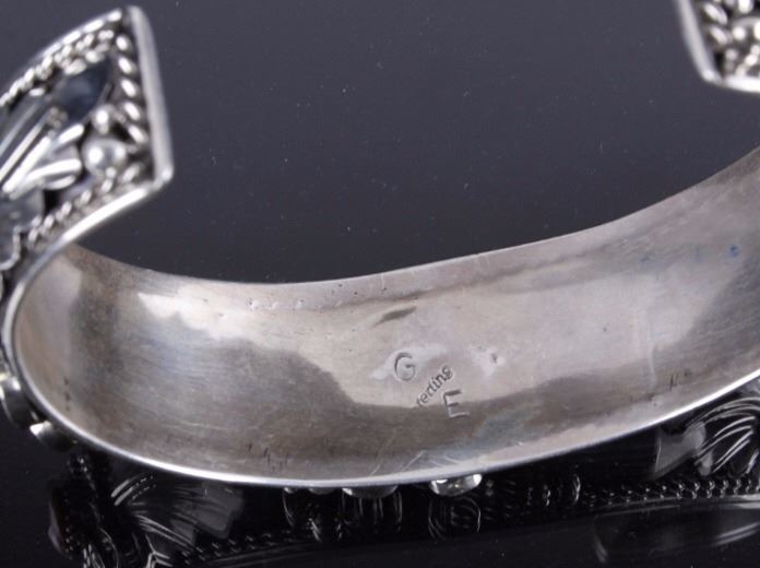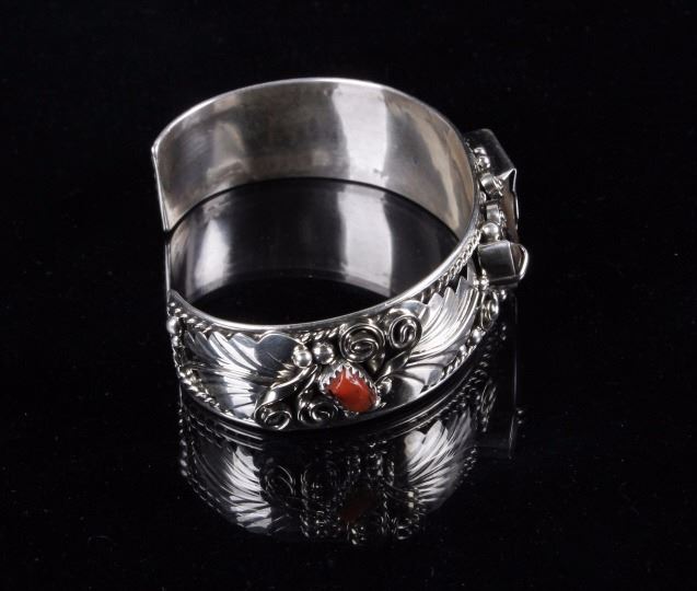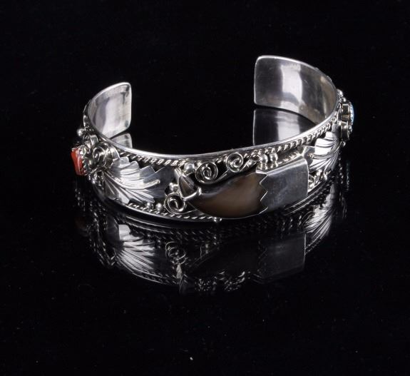 This lot features a sterling silver band with set in bear claw, turquoise and coral band. The band is marked sterling and signed by the artists G.E. The sterling and stones elegantly highlight the central bear claw. The piece is in good condition for its age. Measures: 5 1/2" C x 7/8" W