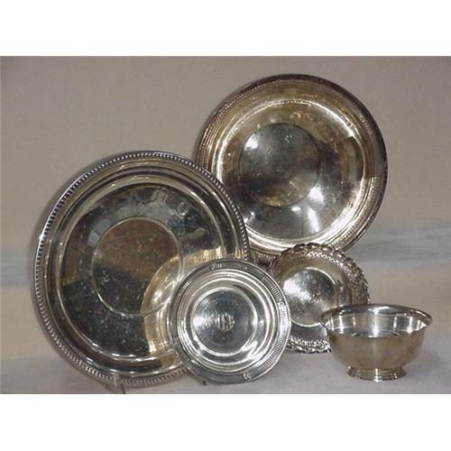 One Paul Revere bowl, 4 7/8" in diameter, 2 1/2" deep, good weight. Slight dents on rim and substantial scratches on interior of bowl. Marked, International sterling. </td></tr><tr> <td> </td></tr><tr> <td>Reference #: 5042_105</td></tr><tr><td>Condition:good</td></tr><tr><td>Year:early 20th century</td></tr><tr><td>Title:Sterling Bowls & Plates SKU 5042</td></tr><tr><td>Location:Fort Lauderdale, Florida</td></tr></table>