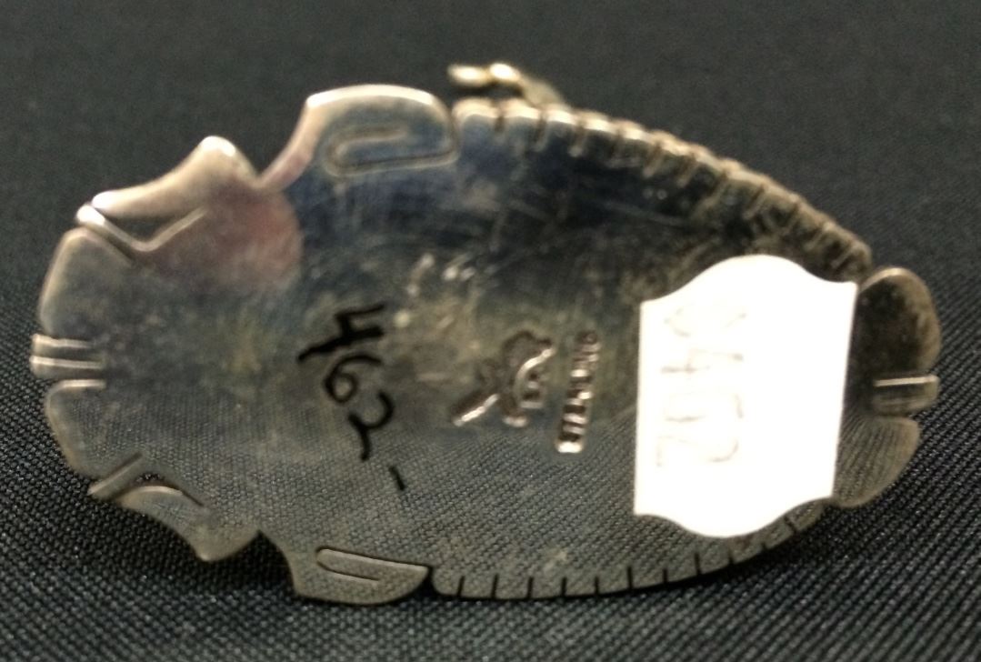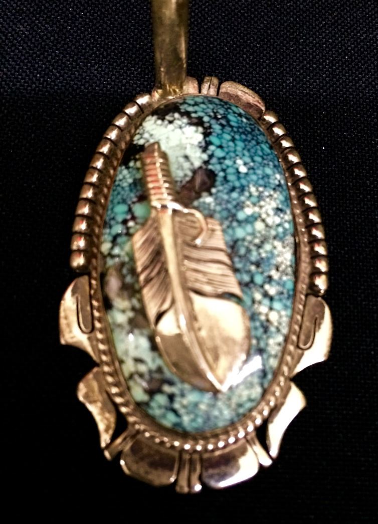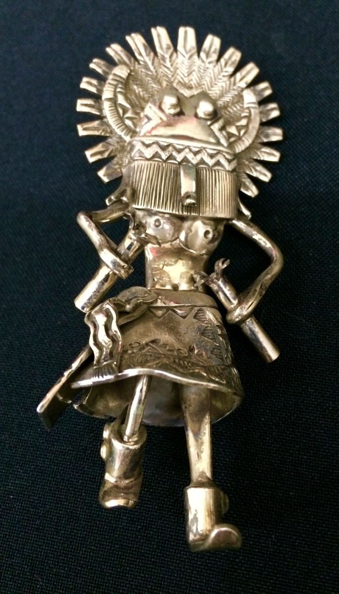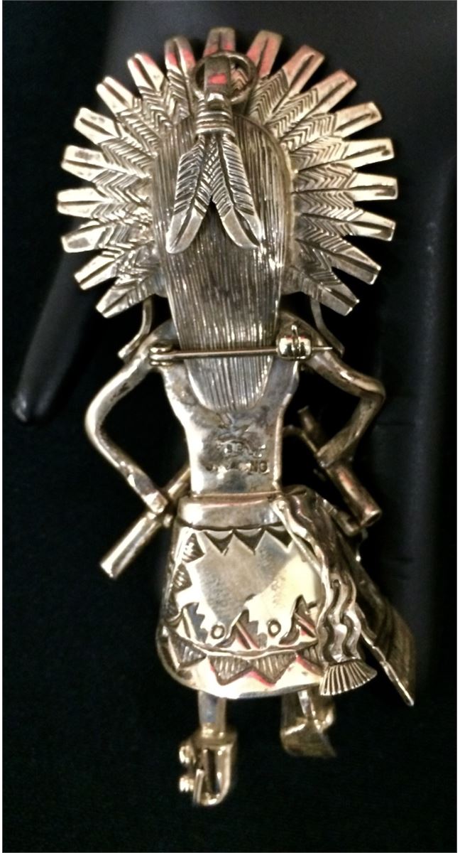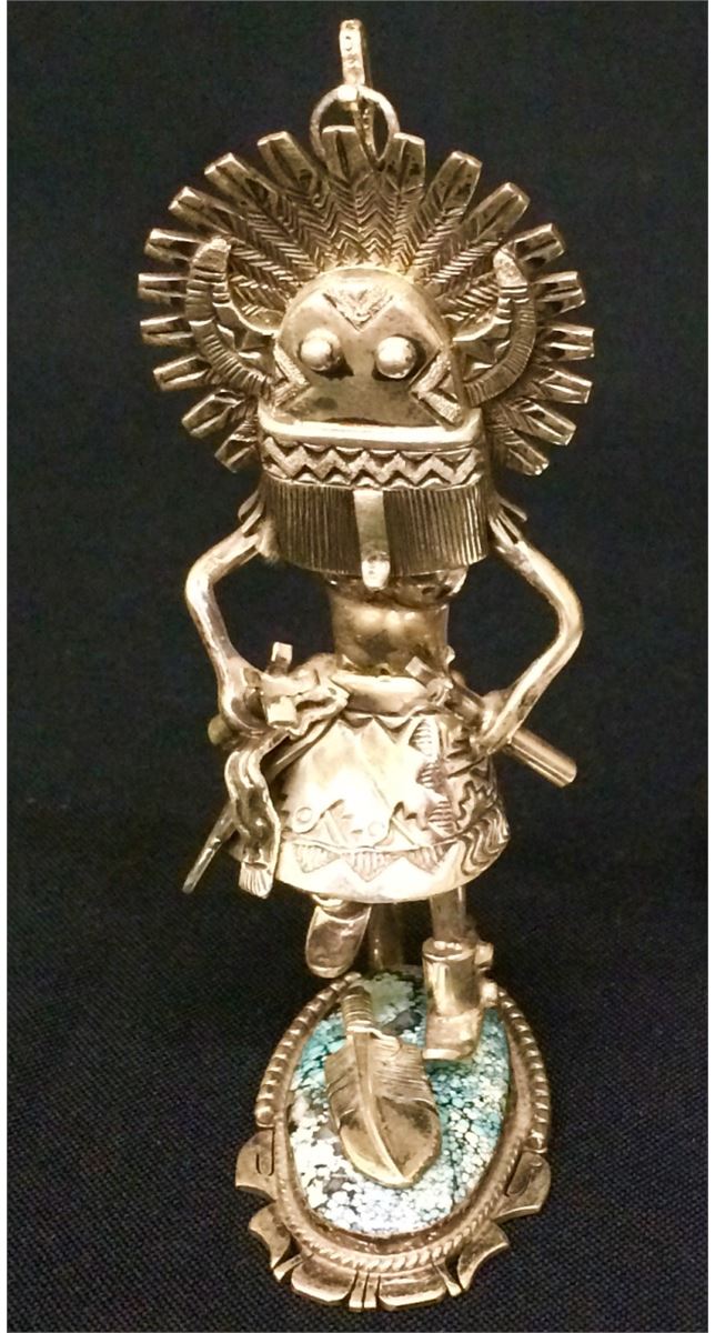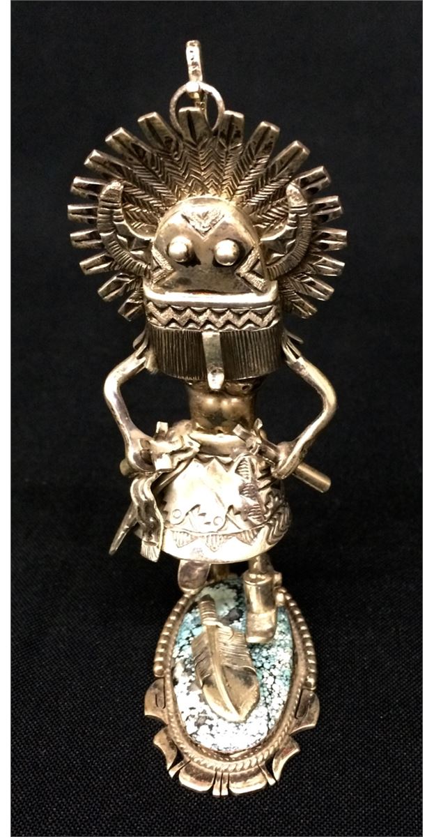 A very unique piece of jewelry! This sterling Kachina figure can stand alone, be used as a pin/brooch or be worn as a pendant! The stand has a beautiful piece of spider web turquoise. A highly artistic piece which stands 4” tall when free-standing and weighs 82g.