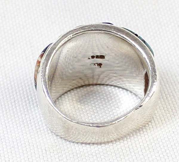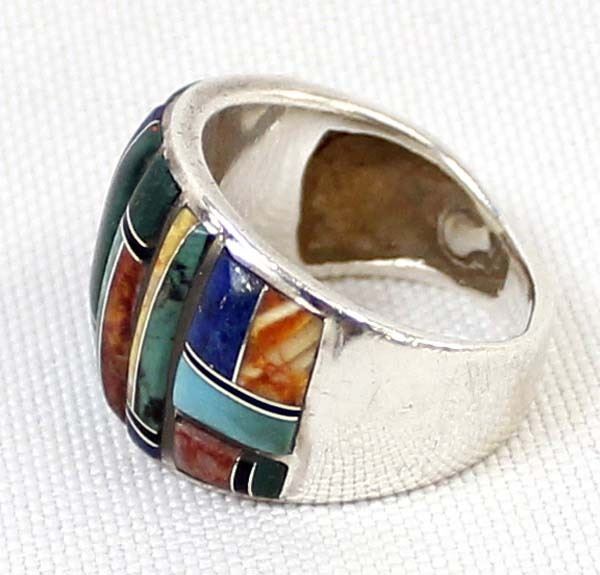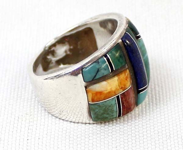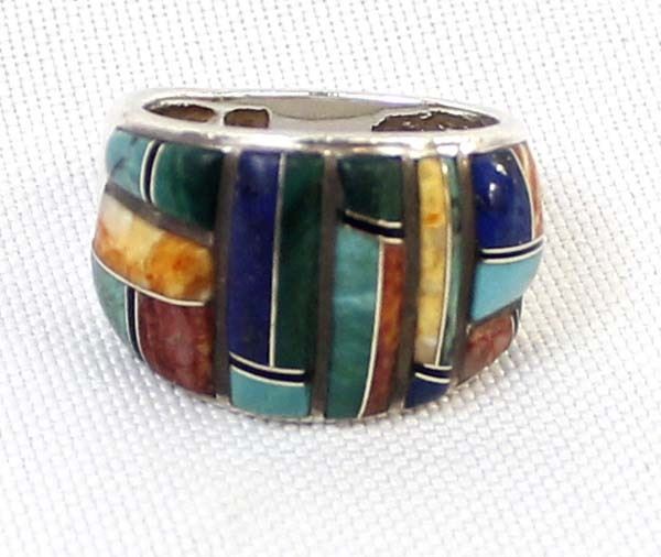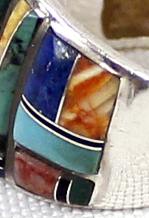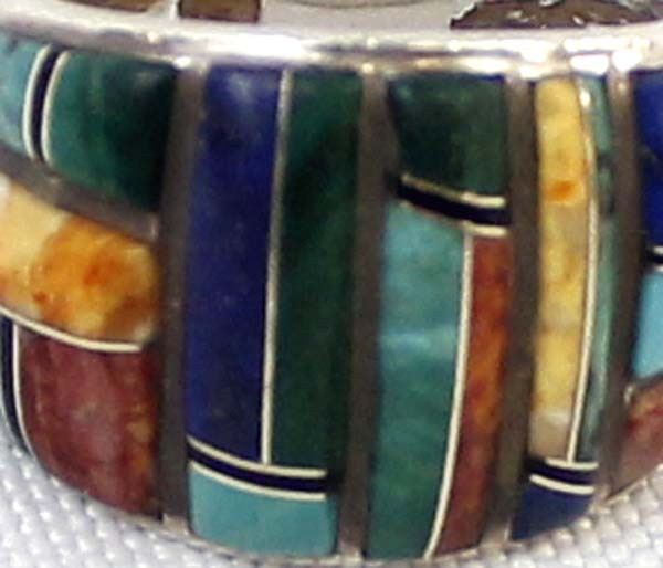 Sterling Channel Overlay Ring, Size 6.5, stamped .925 and measures 5/8''W, overlay consists of orange shell, lapis, turquoise, malachite, and purple shell