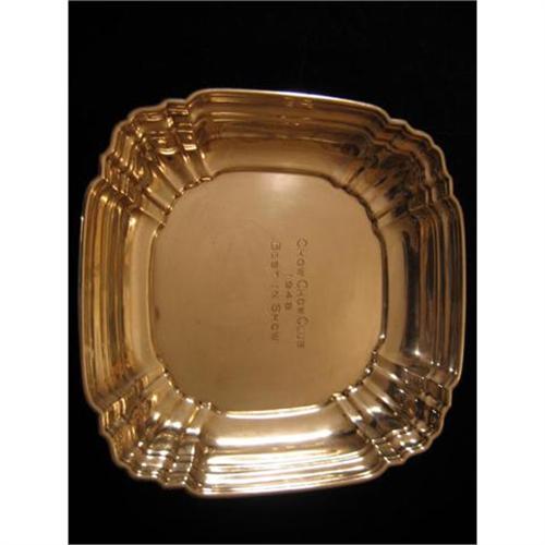 Gorgeous & heavy Gorham solid sterling silver trophy platter/dish awarded by the Chow Chow Club in 1947 for the Best In Show, as engraved in the silver. It is hallmarked on the back, and I had a jeweler weigh it; he finely etched the weight on the back as 24.98 oz. Troy.