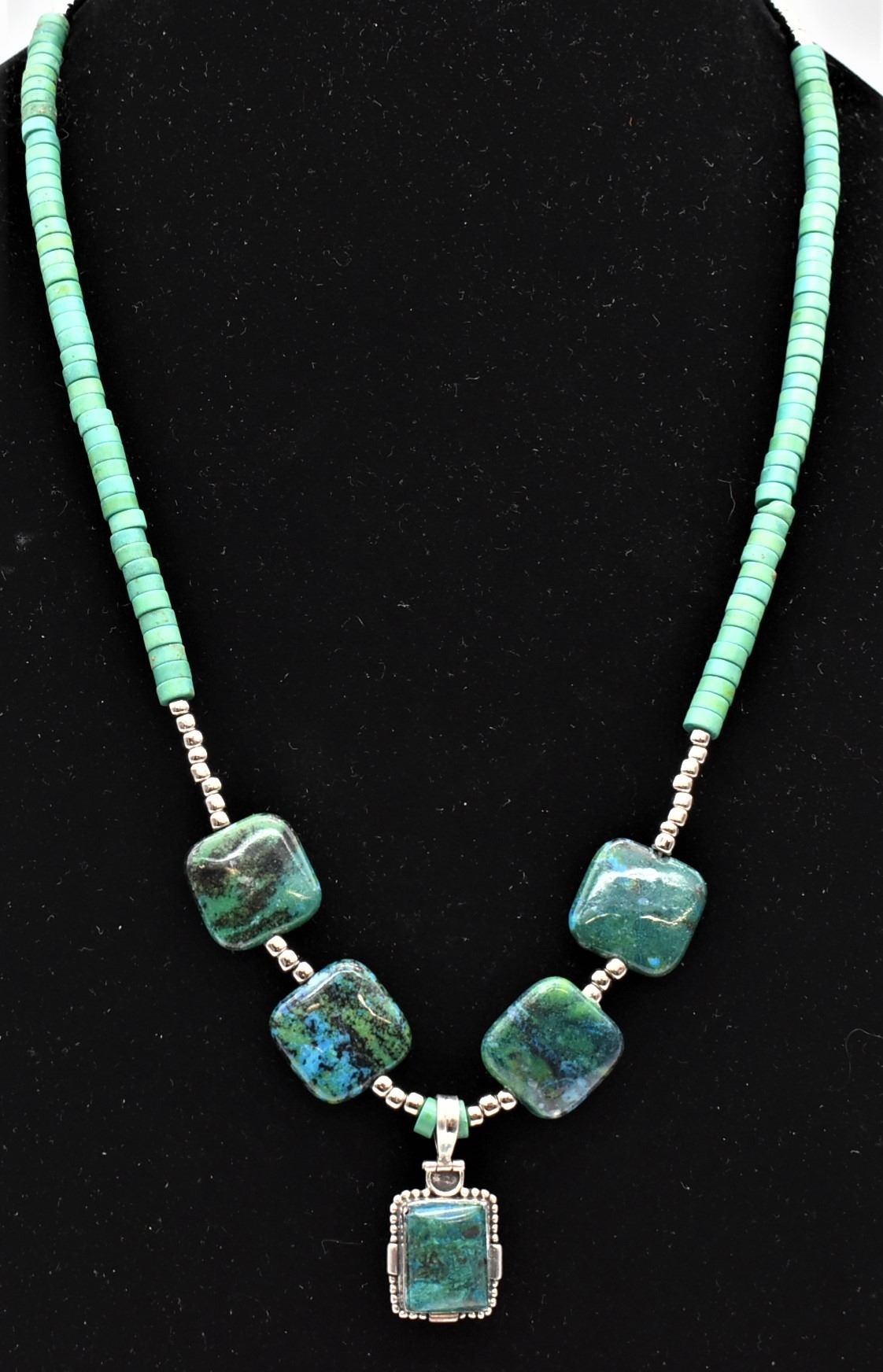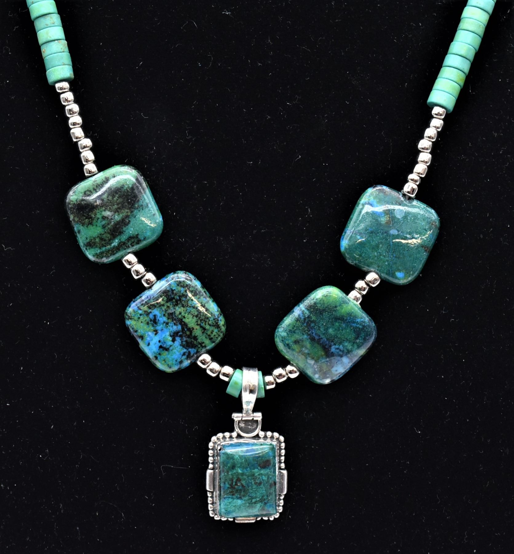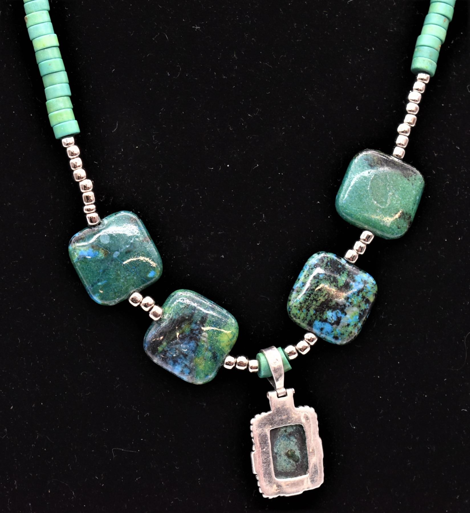 Sterling Chrysacolla Pendant Necklace, sterling pendant measures 1 3/8''L x .75''W and bale is stamped .925, heishi bead necklace measures 24''L end to end and is embellished with silver tone beads and malachite/azurite square beads, lots of beautiful colors in this piece