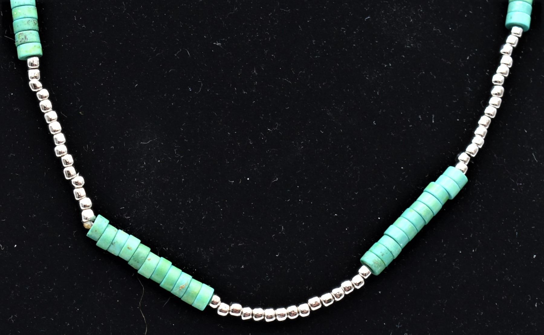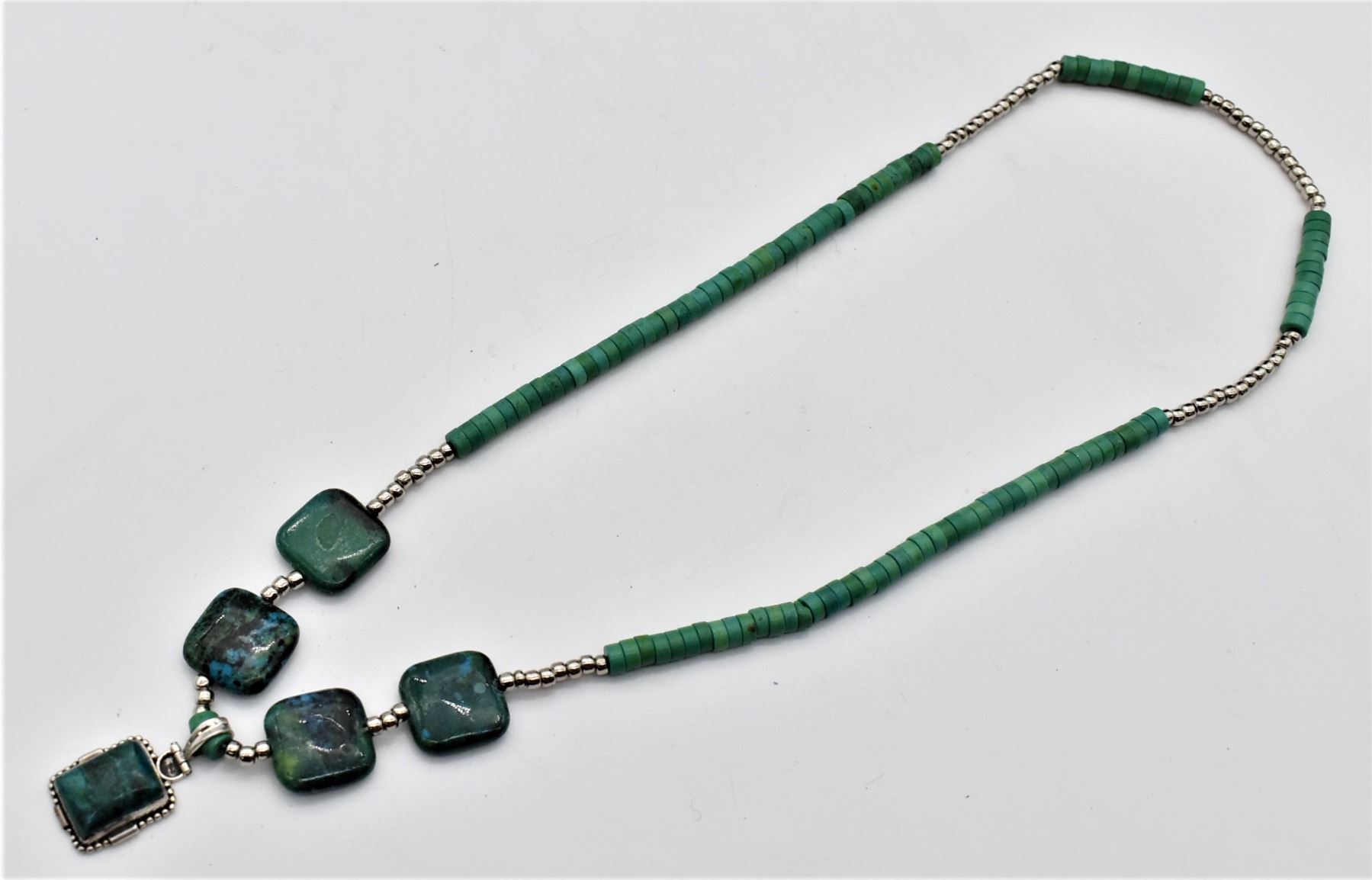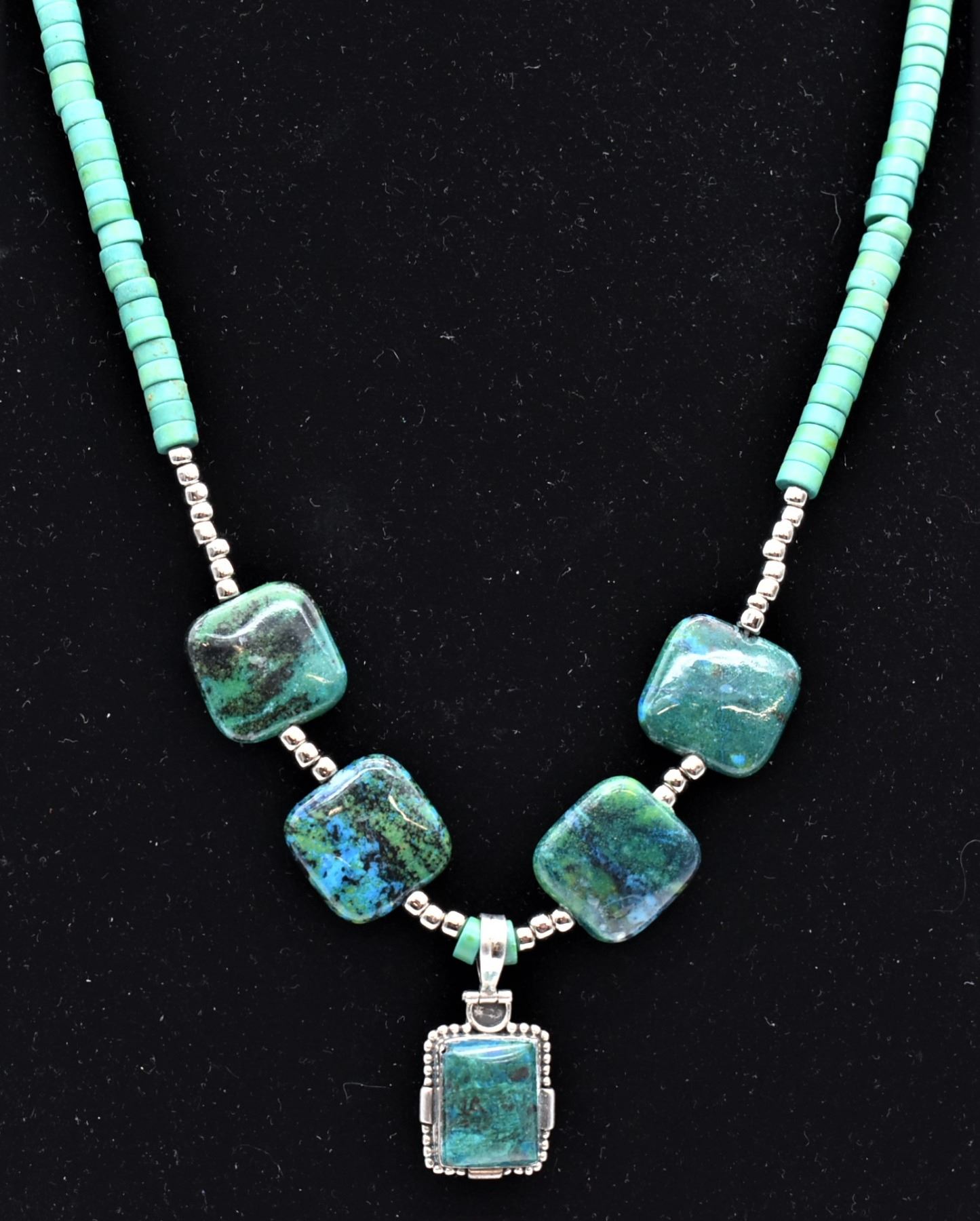 Sterling Chrysacolla Pendant Necklace, sterling pendant measures 1 3/8''L x .75''W and bale is stamped .925, heishi bead necklace measures 24''L end to end and is embellished with silver tone beads and malachite/azurite square beads, lots of beautiful colors in this piece