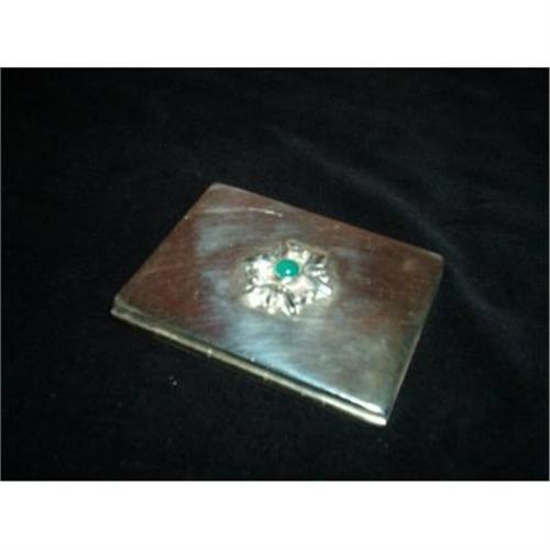 This sterling silver compact measures 2.7/8ths X 2.25. It has an emerald cabuchon cut stone set into a flower decoration. Marked "Sterling". made by R. Blackinton. Circa 1930. Mirror inside.