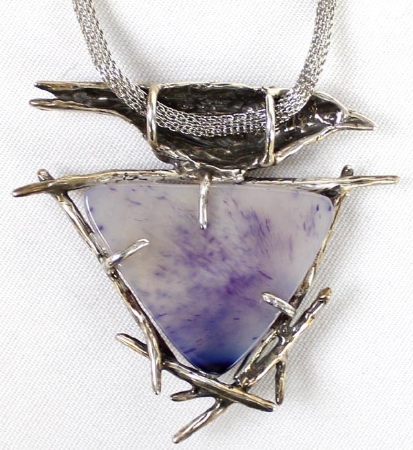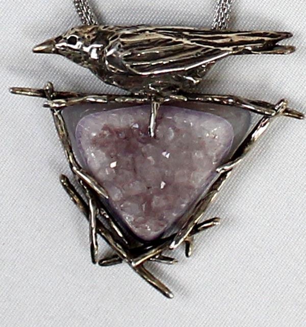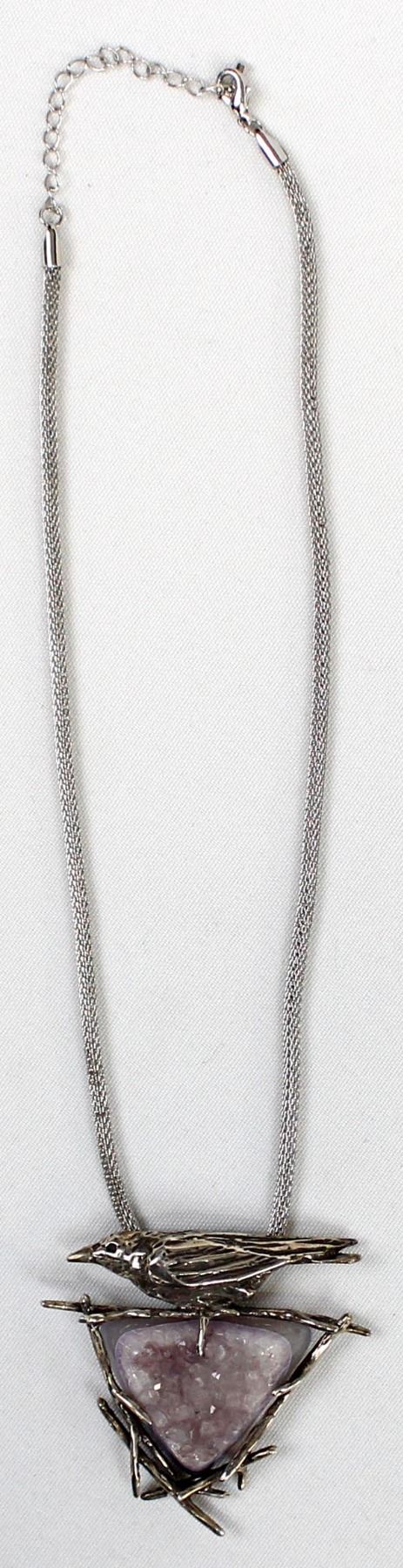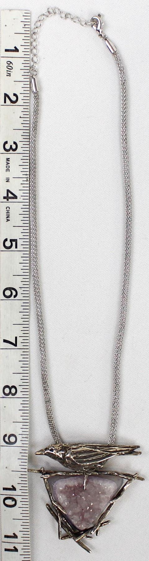 Sterling Crow and Amethyst Druzy Pendant Necklace, pendant measures 2.5'' x 2.5'', mesh chain (which is not sterling) measures 20''L end to end and is adjustable in length