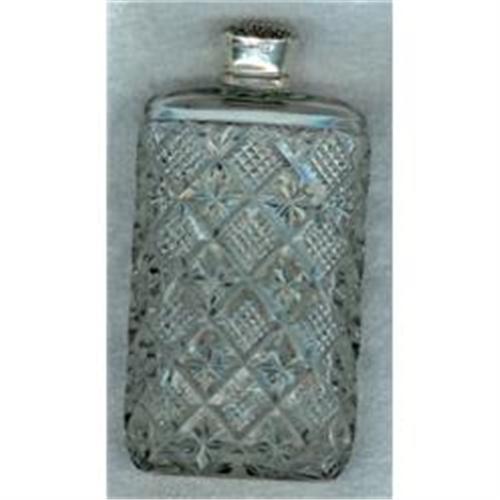An Unger Bros. Hand Cut Lead Crystal Flask.1872-1919. Sterling collar to flask. Sterling screw top. Initial "F" ?? Fabulous condition. Inscribed on the bottom, Co.464 76 4019. 5" to top of Crystal, 4" wide, 1" across base.