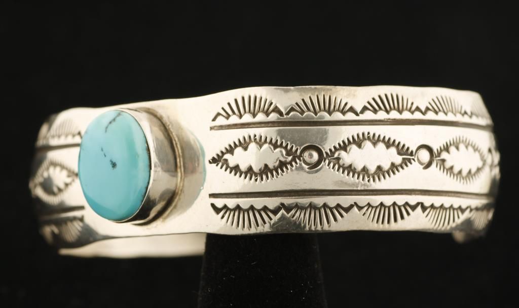 Exceptional sterling silver turquoise cuff. This is a prime example of piecework by a noted Navajo artist. The cuff has a lovely piece of robin's egg blue turquoise with stamp work down the cuff. It will easily fit a 7" wrist and is slightly adjustable. The cuff weighs over 20 grams.