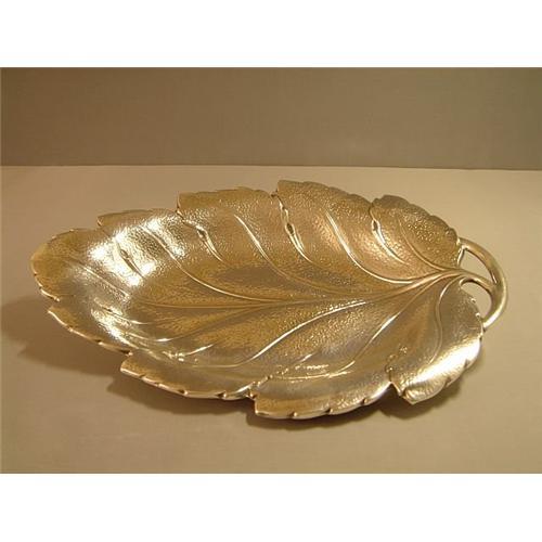 This is a fabulous dish. It is Sterling silver made by the American firm Reed and Barton in 1936. See hallmark.It has a super design of a leaf showing in detail the veins and structure of a natural leaf.It is hand hammered and the silversmith obviously put importance on quality and detail! It weighs 14.5 ozs.It is a very practical size H.1 x W.12.5 x D.9ins It could be used as a fruit dish on a table, or you could serve srawberries at a tea party etc. Of course it is also a beautiful object of art just sitting there on the sideboard waiting to be admired!
