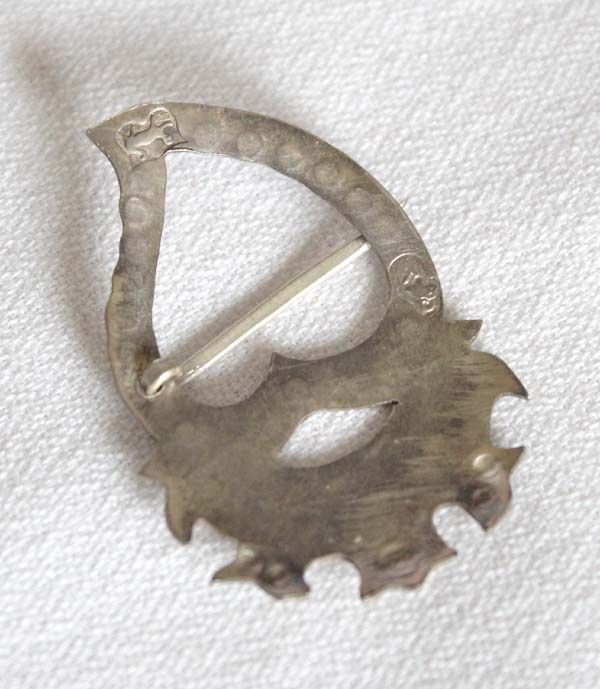 Sterling Early European Trade Item Pin Replica by Colleen & Tom Kozlowski, measures 1.5'' x 1'', hand stamped details, unusual pin closure, center of this pin is heart shaped, this is a replica from Early European Contact in the Midwest, has two hallmarks embossed on back one of which is a ram's head over the letter K and the other appears to be a crude Manticore, 4.25g in total wt.