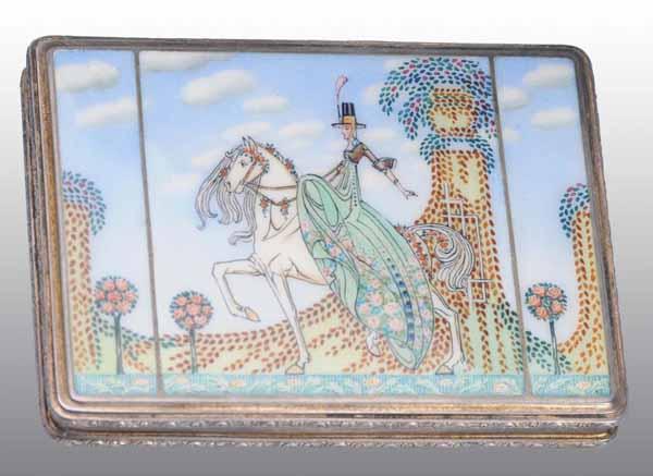 Description By Alfred Dunhill depicting a lady on a horse. Strong hinge with no scratching or damage to the enamel. Condition (Excellent). Size 3" x 2 - 1/2".