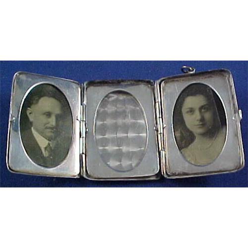 It features 3 oval openings for pictures and 2 instant ancestors. The front is a simple linear design with monogram, possibly RW. There is a loop so that it can be worn on a chatelaine or chain, but it also stands on its own. This piece is marked for Warwick Sterling Co of Providence, Rhode Island (under her picture). This company was in business from 1914 to about 1922. It measures 1 3/4" by 1 1/4" and is in extremely good condition. </font>