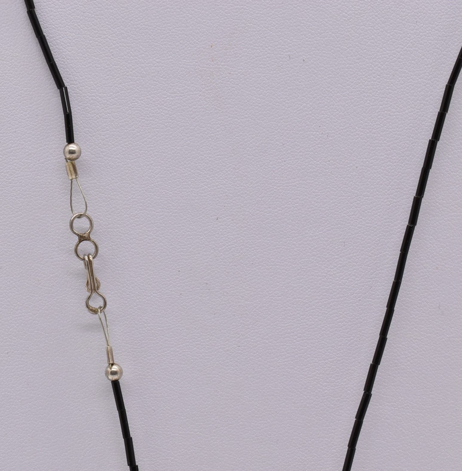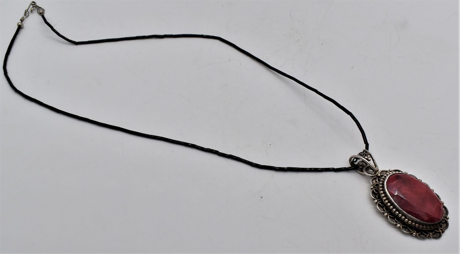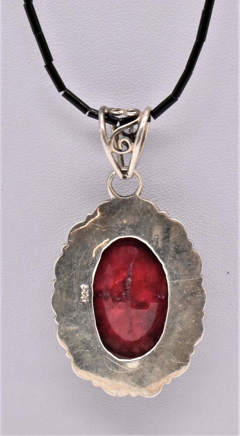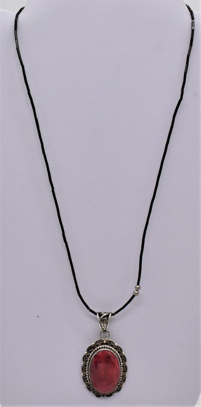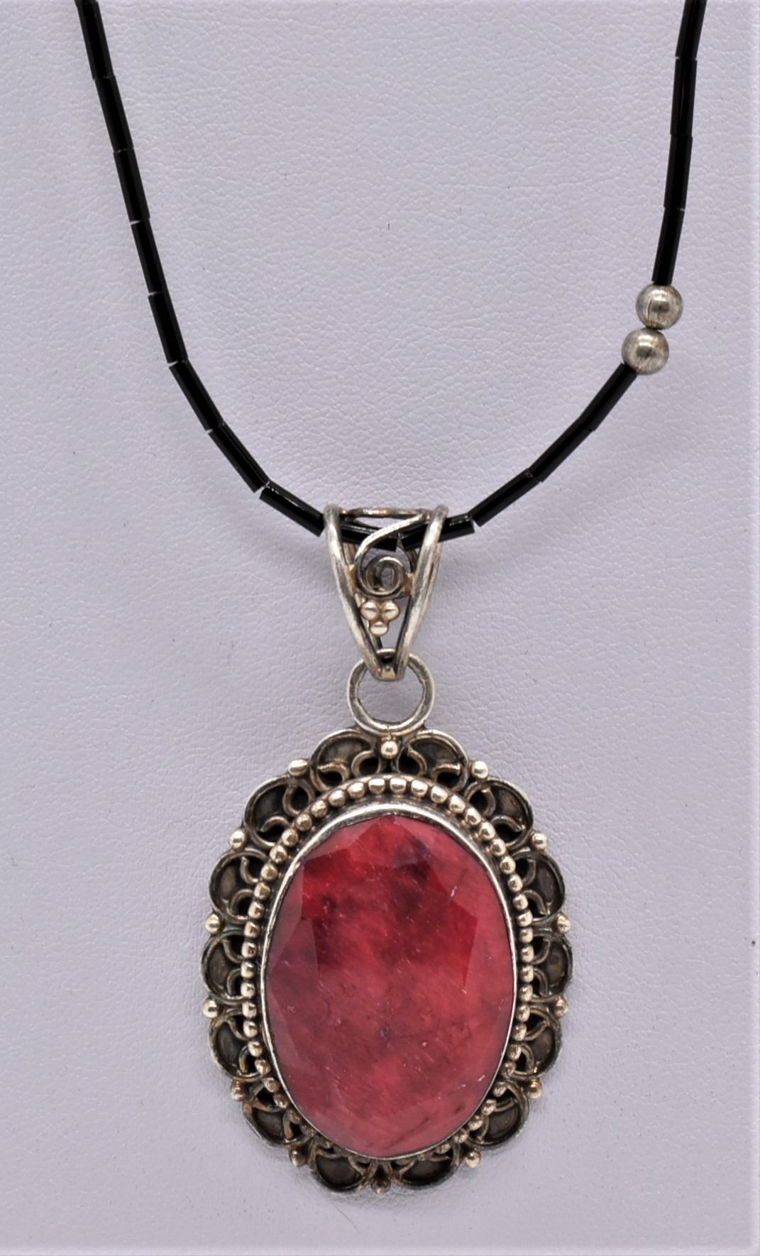 Sterling Faceted Dyed Ruby Stone Pendant Necklace, pendant is stamped .925 and measures 2.25''L which includes the bale x 1.25''W, black heishi necklace measures 22''L end to end