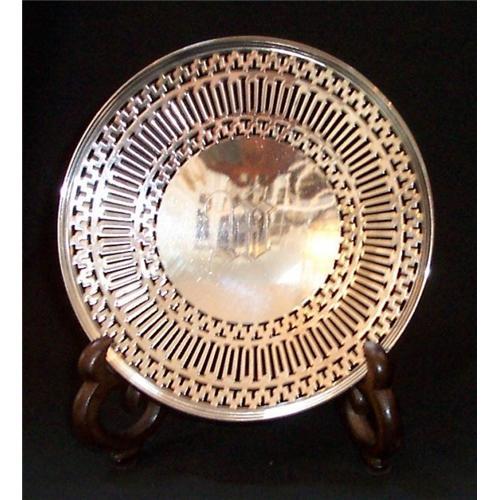 An antique 6" filigree stamped sterling dish with a M monogram. Please feel free to view our other estate items just listed at Alison's antique art.