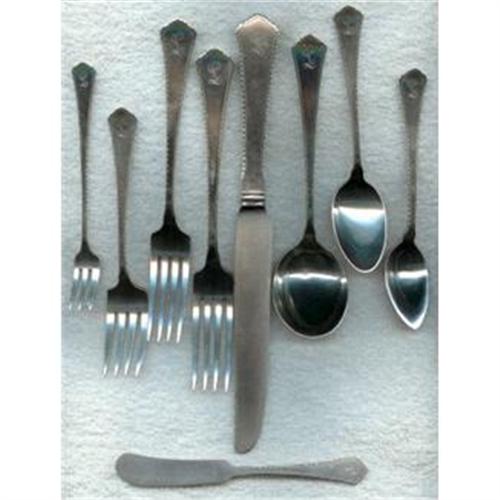 12 Dinner Forks 7.1/2" 12 Dinner Knives 9.1/2" 12 Luncheon Forks 7" 11 Salad Forks 5.1/2" 12 Cream Soups 6.1/2" 12 Iced Tea 7.1/2" 13 Cocktail Forks5.1/2" 12 Citrus Spoons 5.3/4" 11 Butter Knives 5.1/2" 11 Teaspoons5.3/4" 1 Meat Fork7.3/4" 3 Serving Spoons 8.1/4" 1 Cake slice 9.1/2" 1 Jelly Spoon 6.1/2" 1 Large Serving Fork 8.1/2" 1 Petit Four server 6.1/2" (126 Pieces) Beautifully simple. Made by the Wallace Co. in 1926. Monogrammed "L". What a wedding present! Box included.